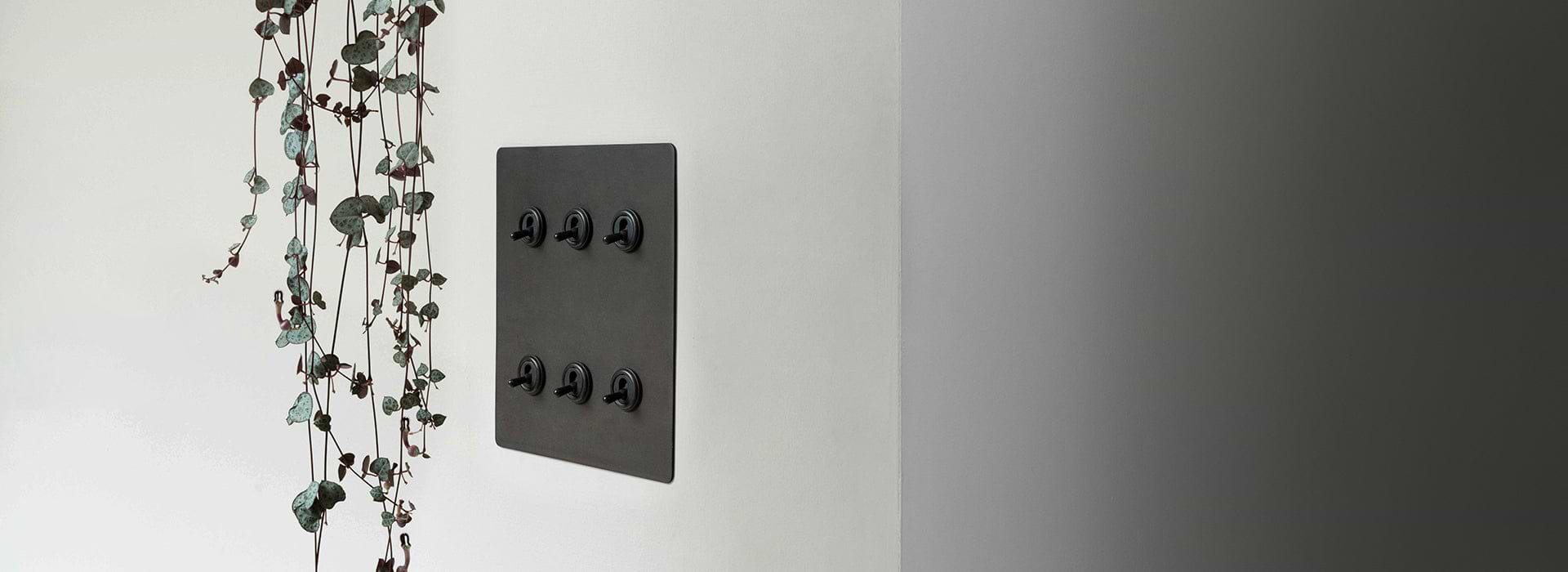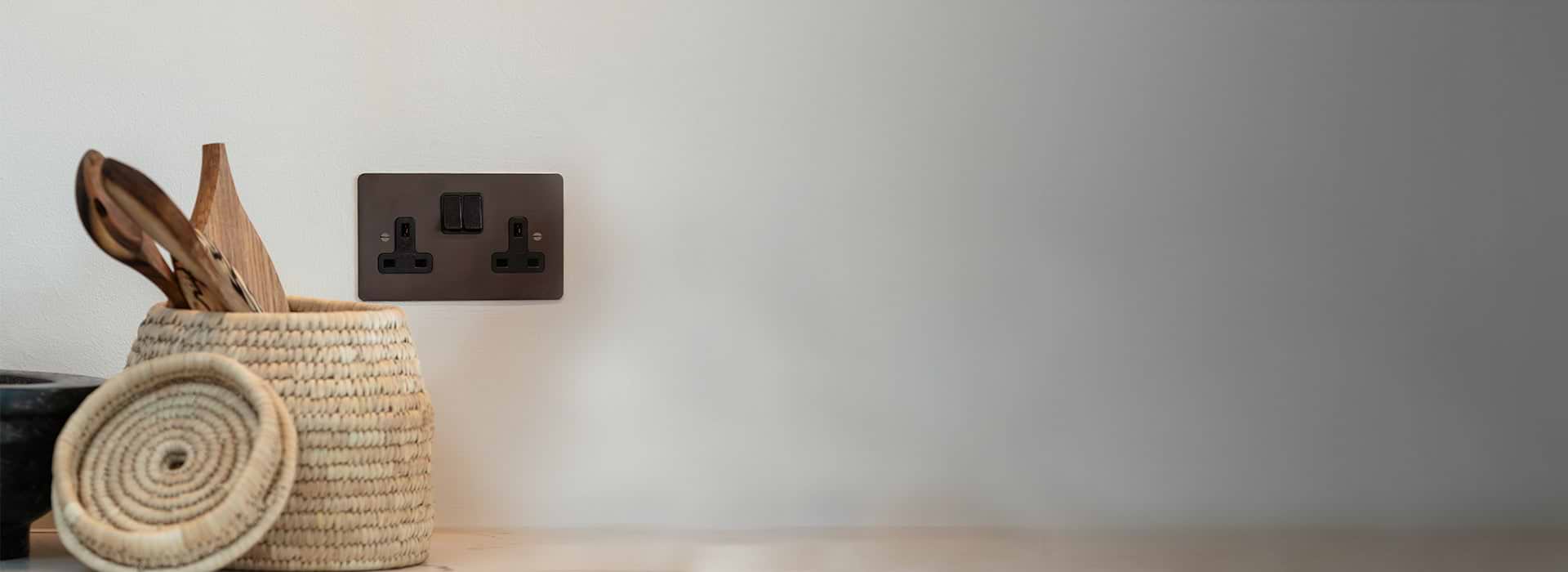 Bronze power sockets and light switches with toggles, rockers or dimmers.