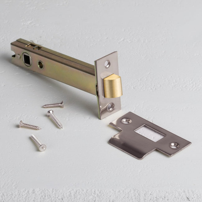 - Polished nickel-finished face plate and strike plate made from solid brass