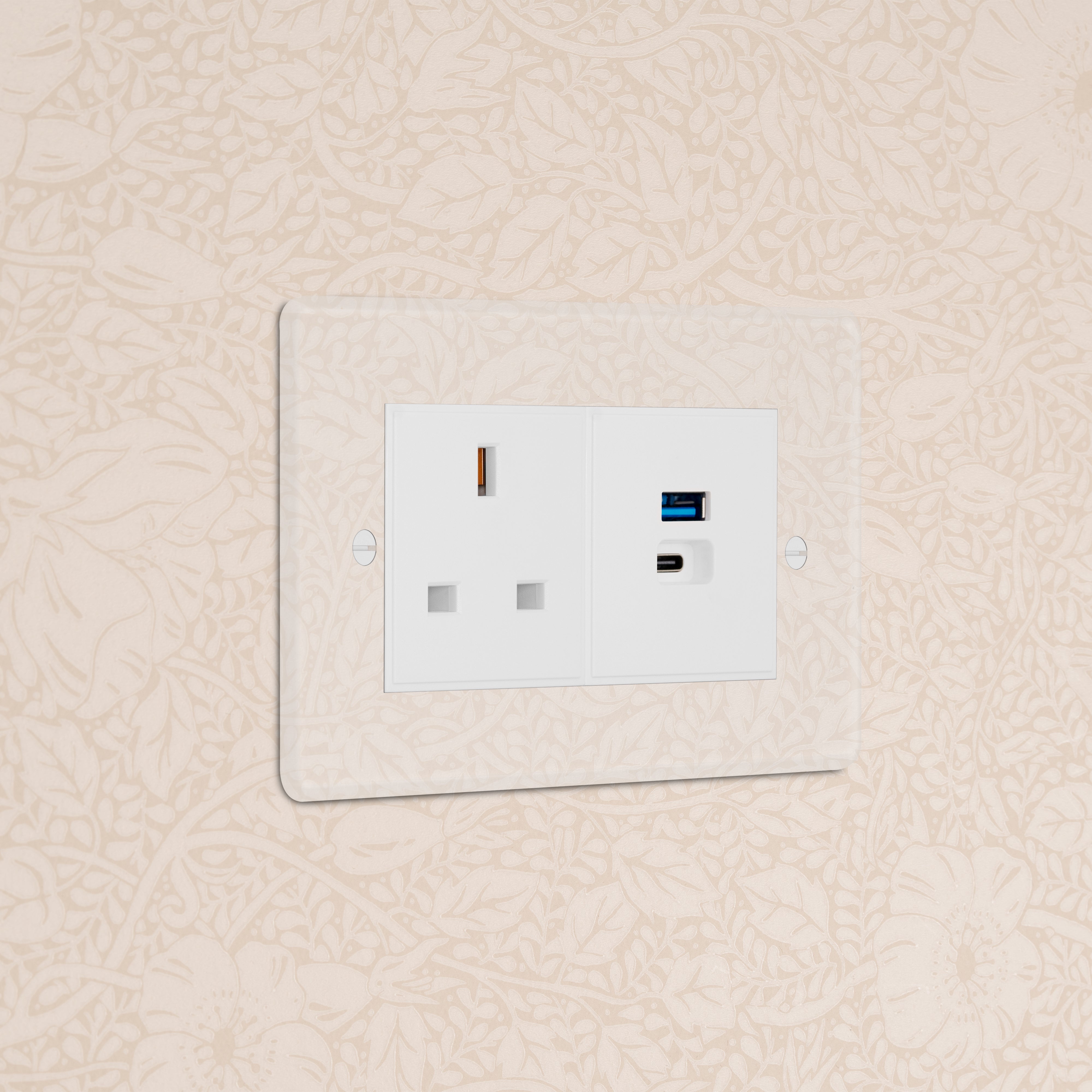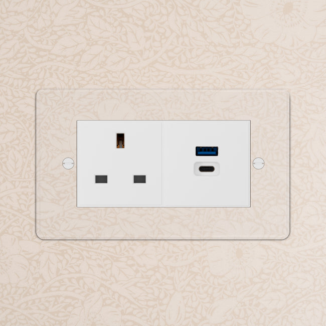 This double mixed socket combines an unswitched 13A socket and a dual USB-A+C fast charge socket on one plate.