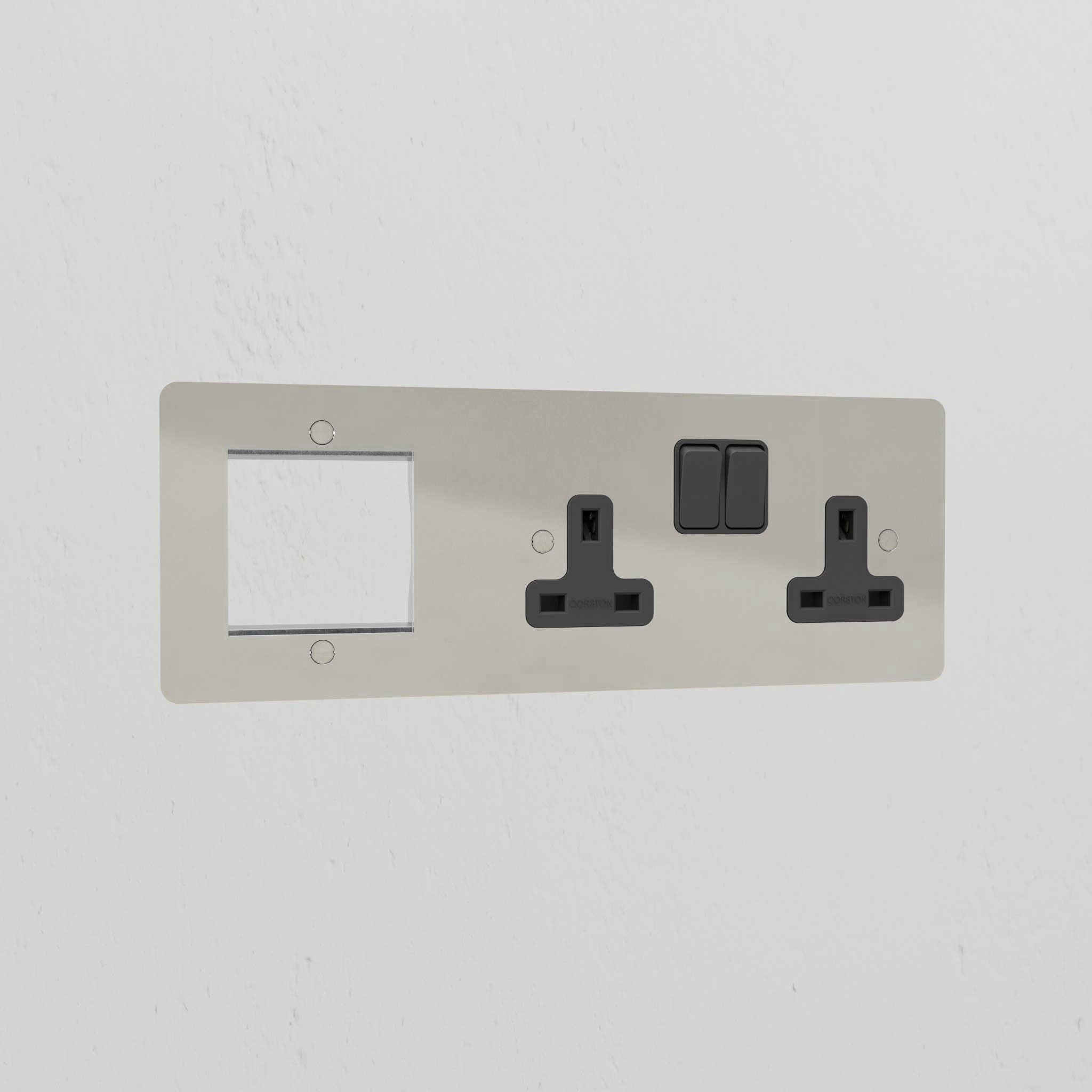 This 50mm module plate in bronze works with any one of our 50mm or two 25mm modules (just make sure you choose the ones made with black plastic). It comes with two built-in UK sockets too.