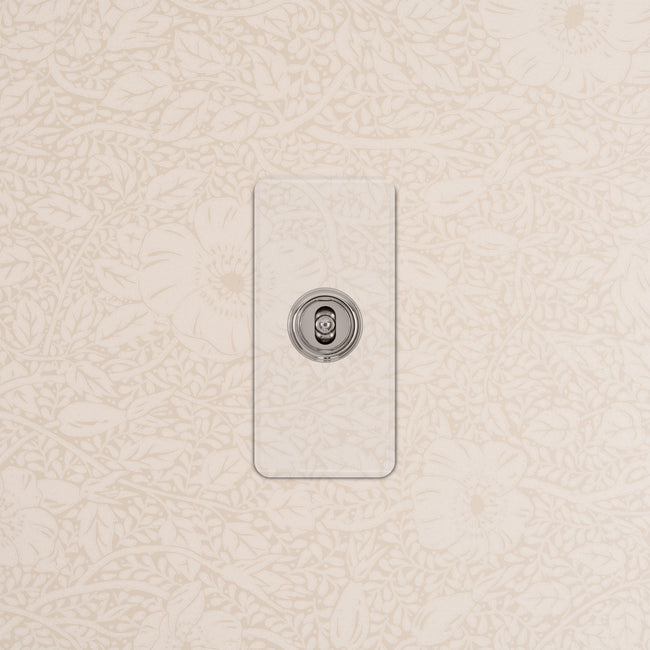 We make our clear collection from polycarbonate, which is more flexible and durable than the usual acrylic. The toggle is made from solid brass in our polished nickel finish.