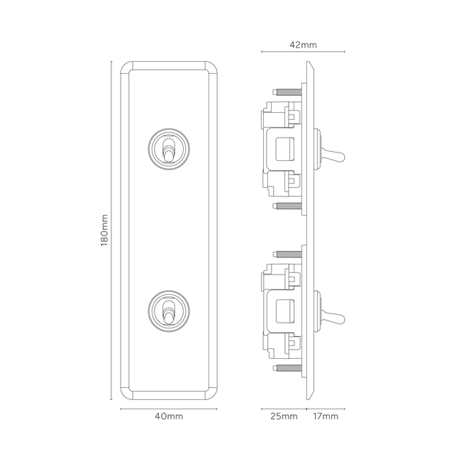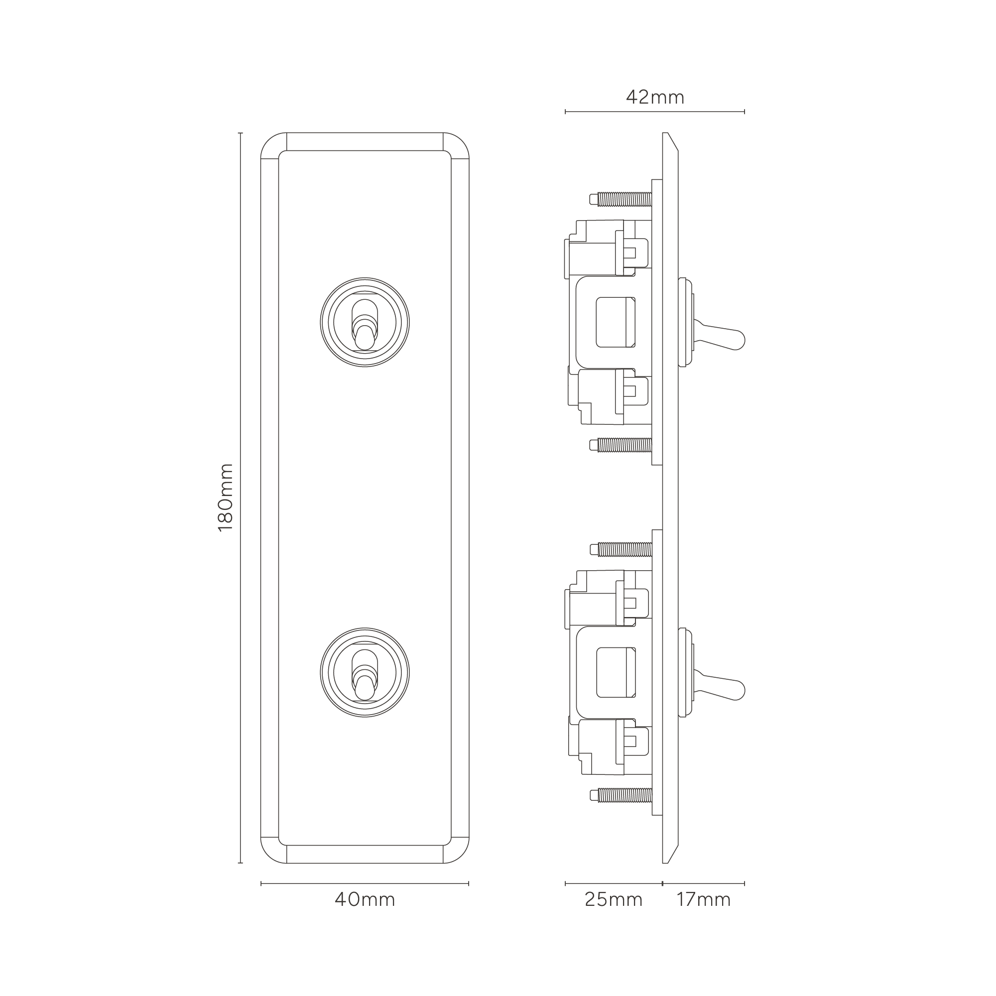 Our 2 gang architrave two-way toggle switch is a modern take on the classic dolly design. We’ve crafted it to be as sleek and timeless as possible in any interior setting.