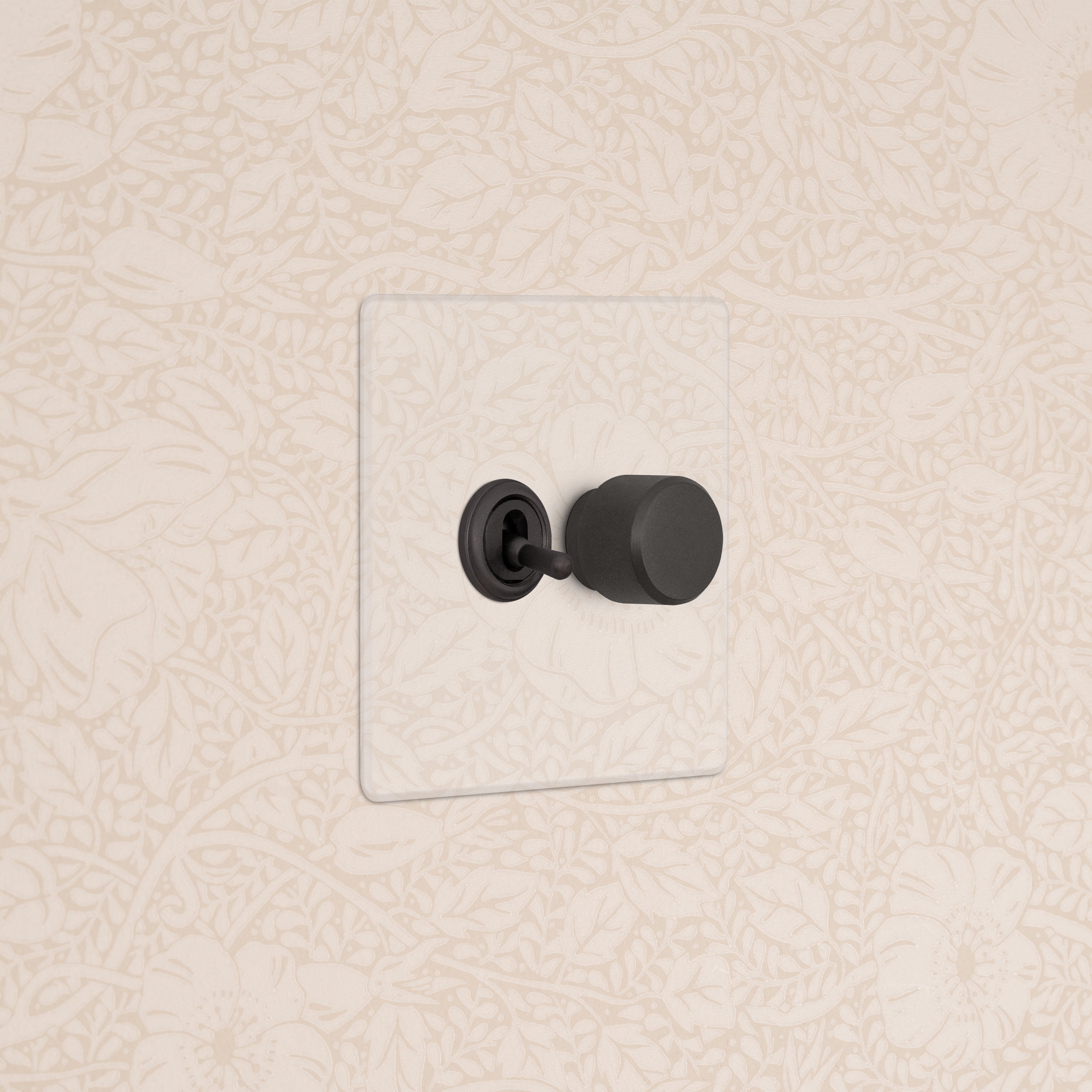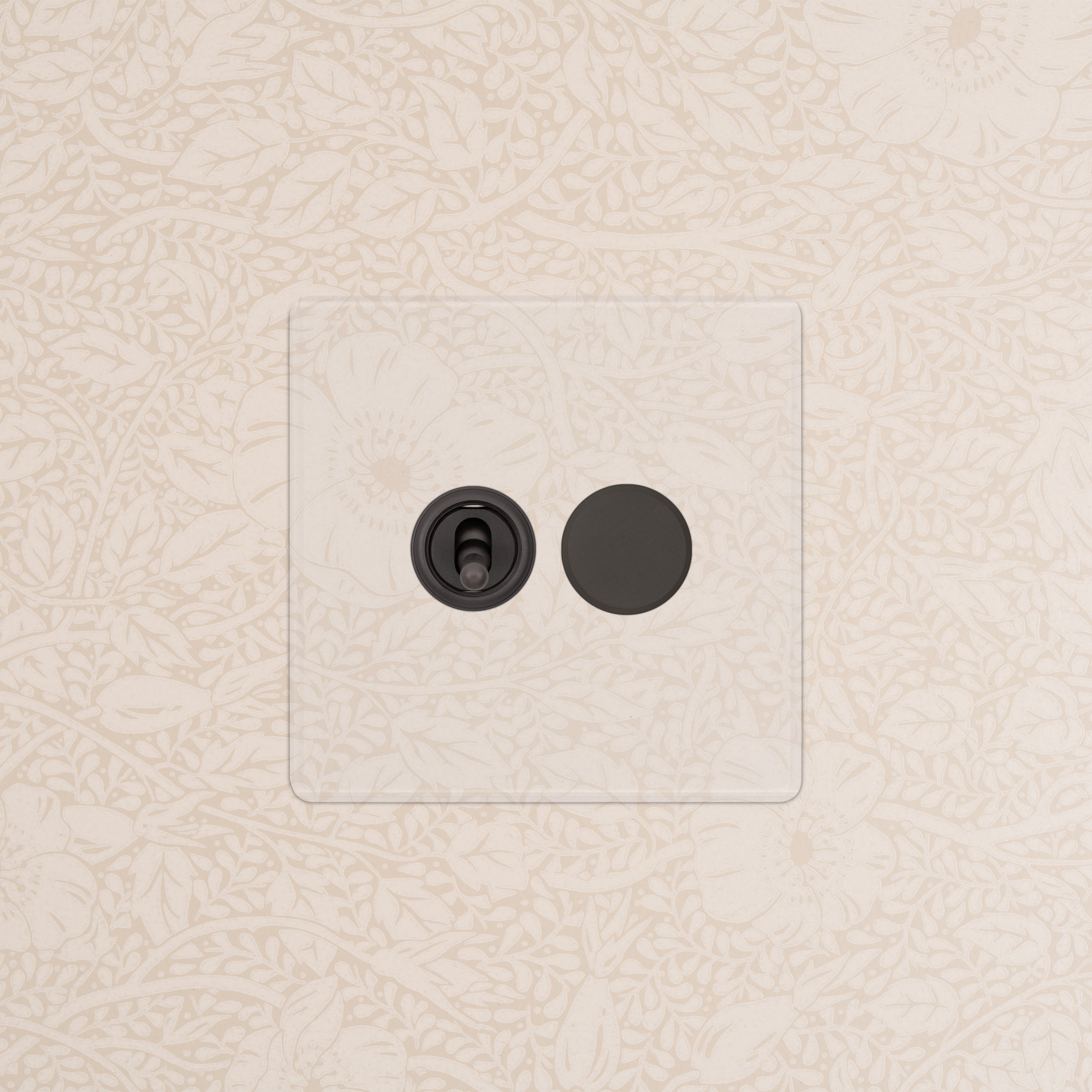This 2 gang mixed switch combines a two-way toggle and a rotary dimmer on one plate.