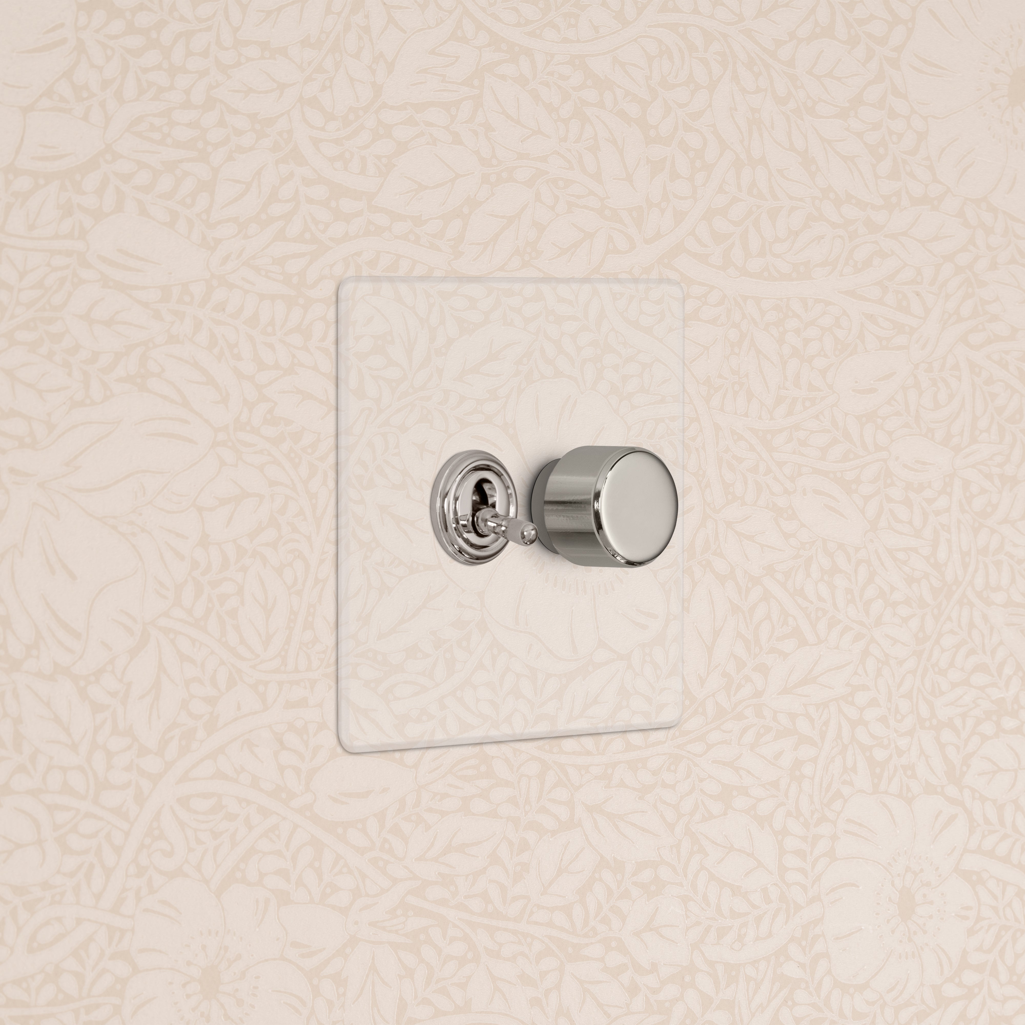 This 2 gang mixed switch combines a two-way toggle and a rotary dimmer on one plate.