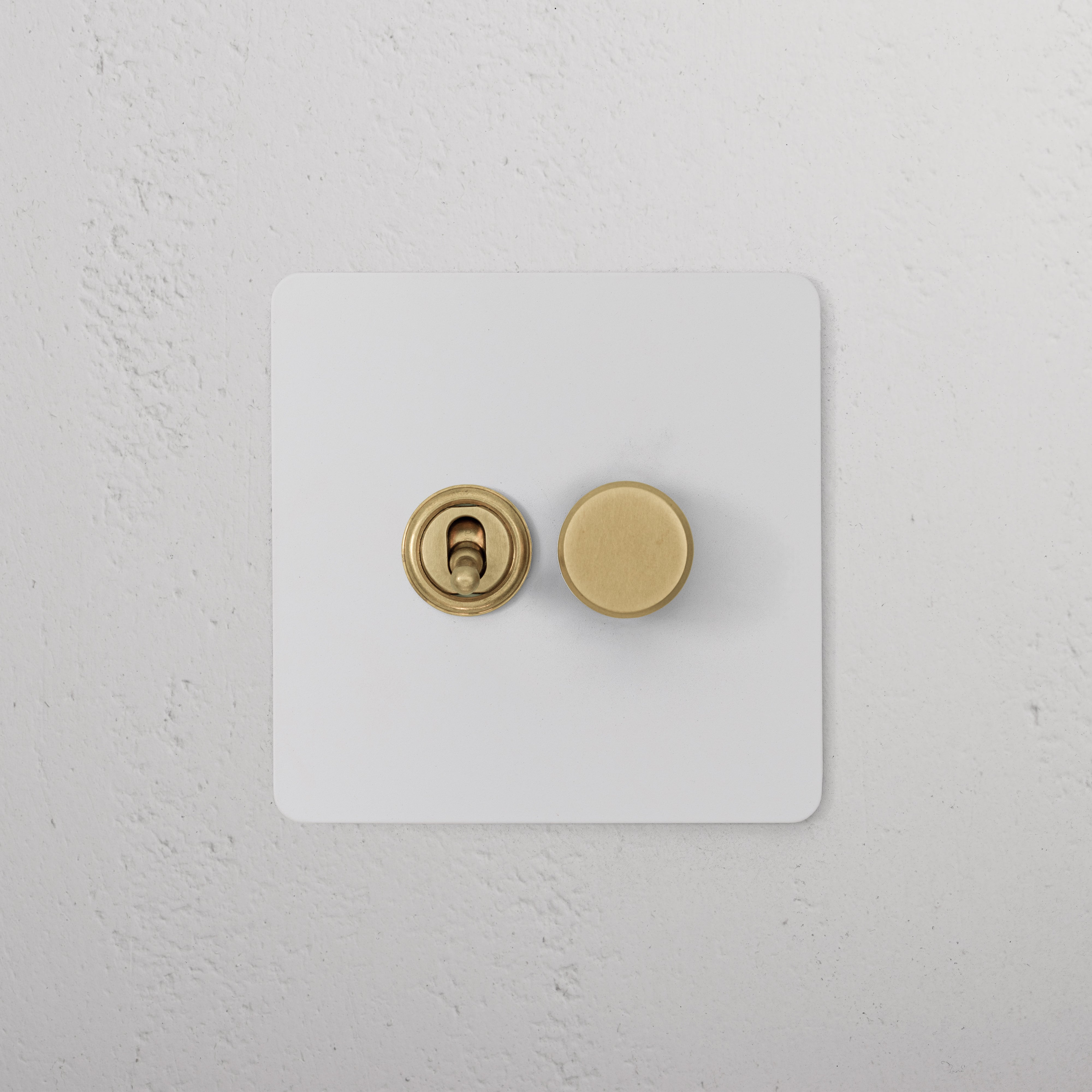 This 2 gang mixed switch combines a two-way toggle and a rotary dimmer on one plate.