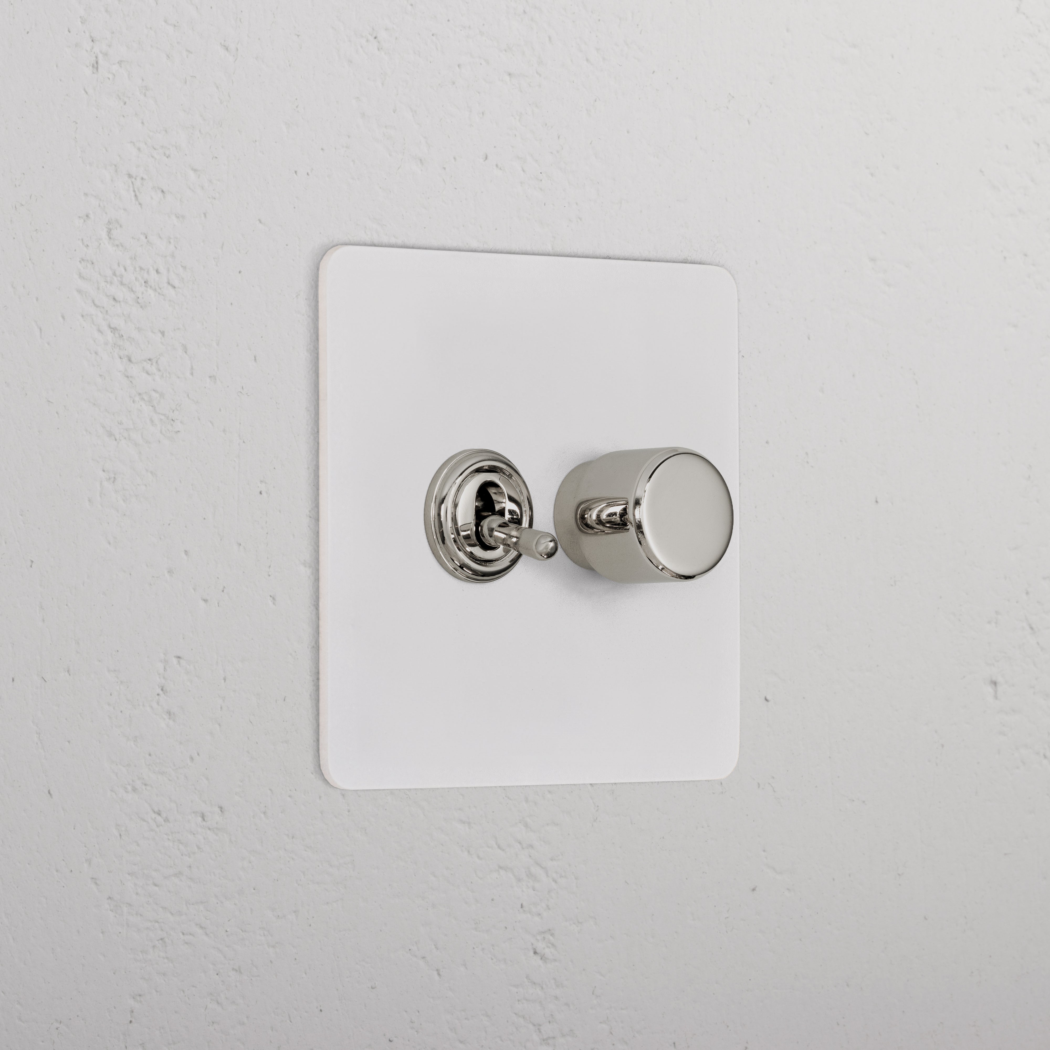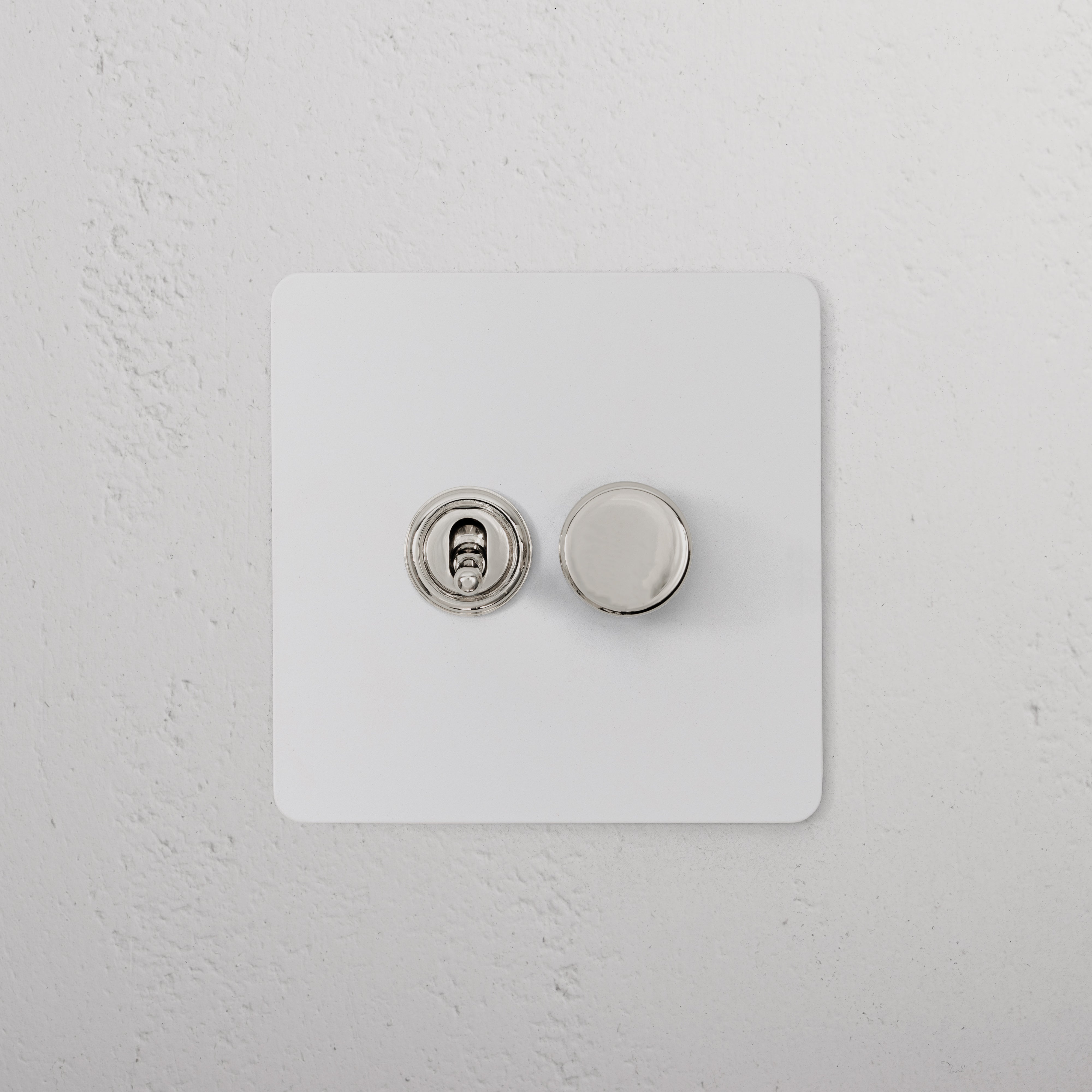 This 2 gang mixed switch combines a two-way toggle and a rotary dimmer on one plate.