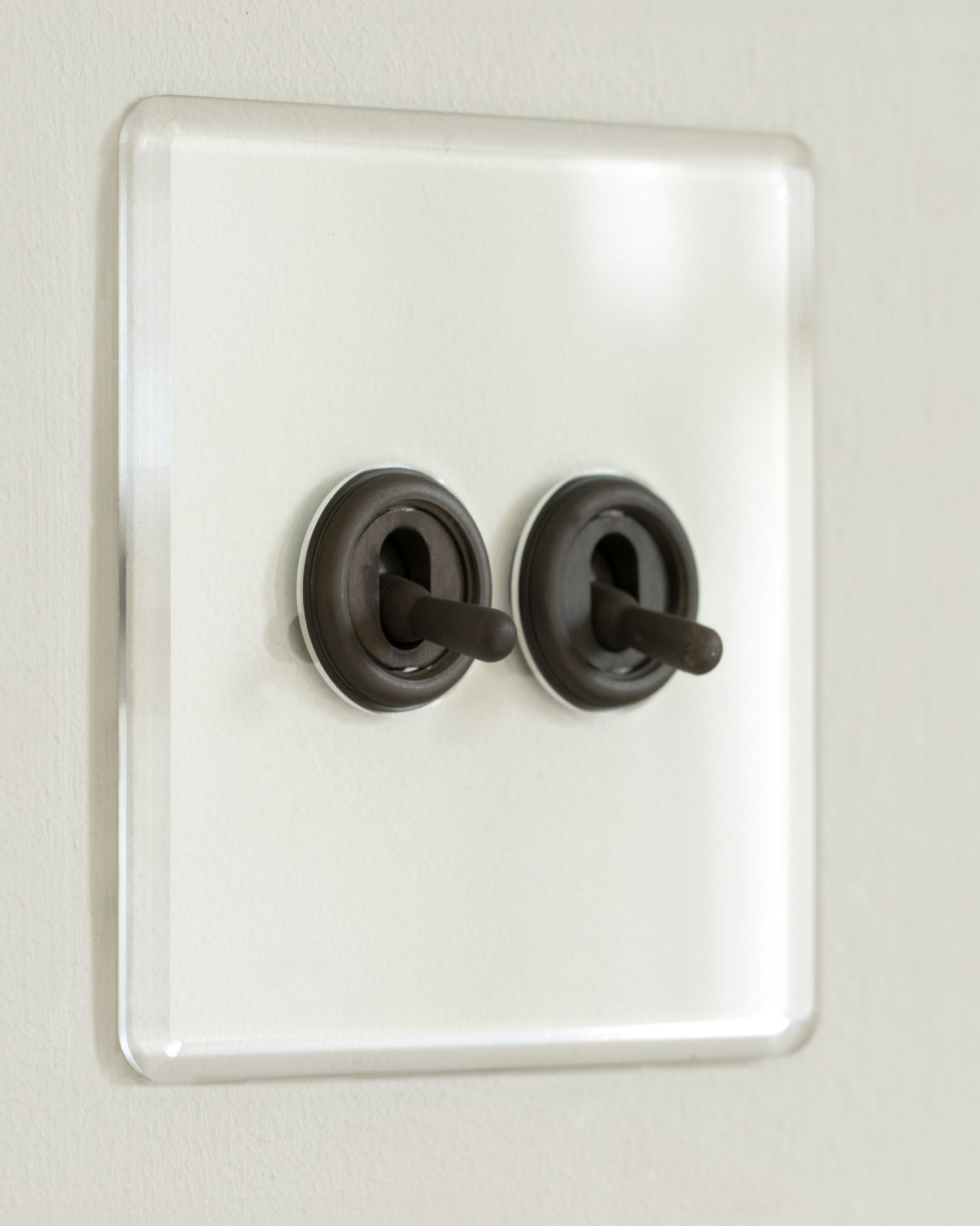 We make our clear collection from polycarbonate, which is more flexible and durable than the usual acrylic. The toggles are made from solid brass in our bronze finish.