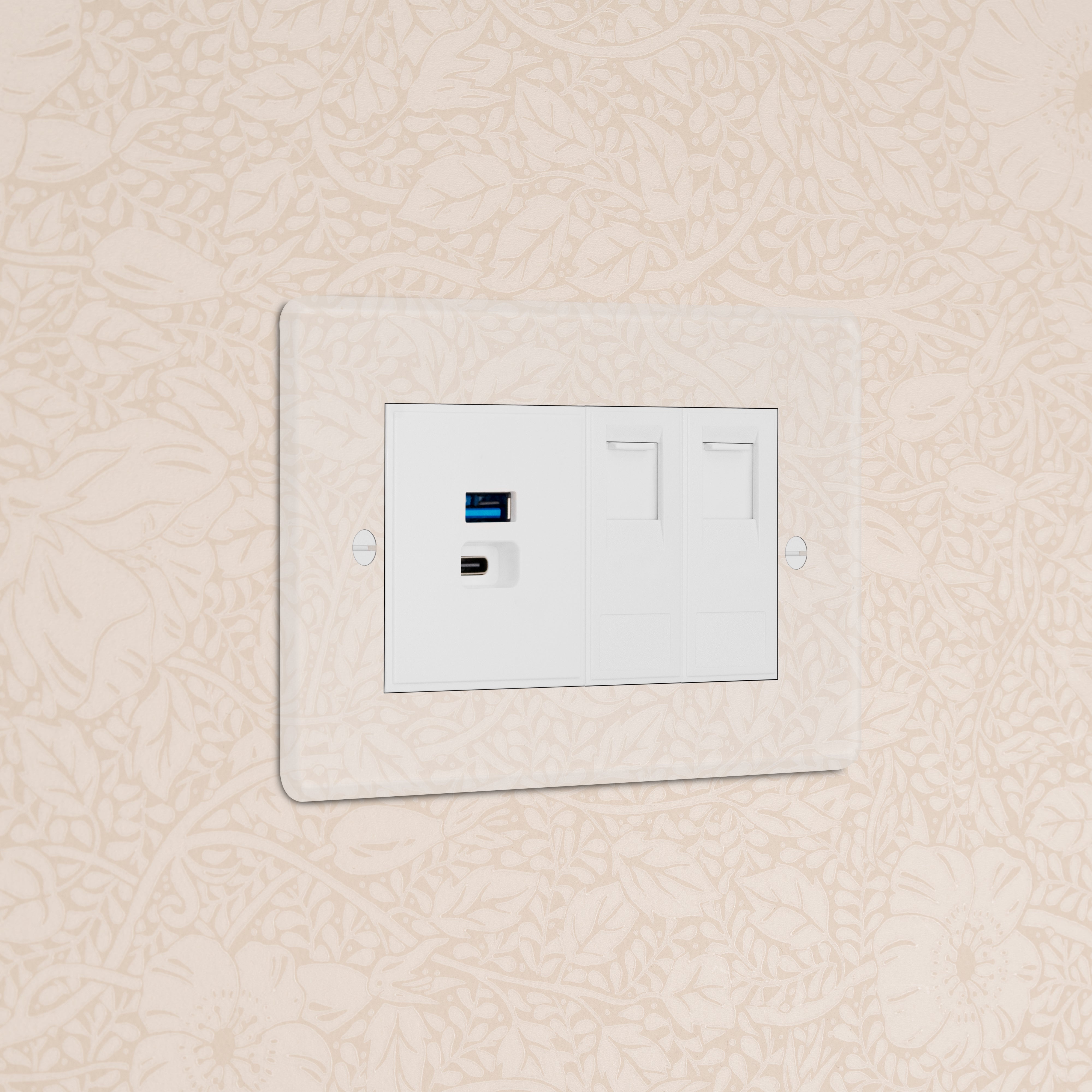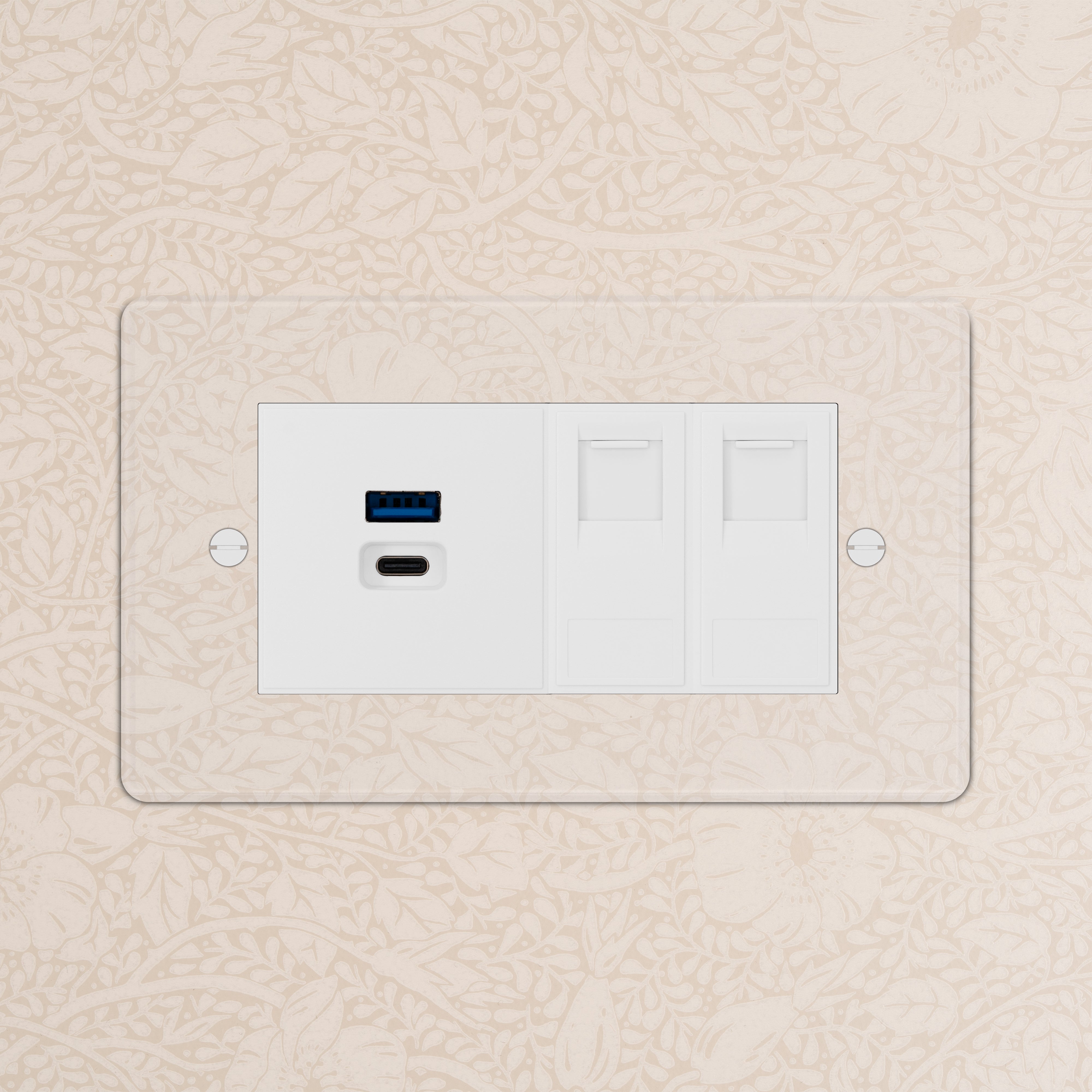 Connect two Ethernet cables and USBs A and C through this double CAT6 and USB Socket. It's ideal for fast charging and quick internet speeds. The clear plate is made from 2mm transparent polycarbonate, which gives the illusion of the outlet being built into the wall. It comes with a paper template for you to either paint over with your chosen wall colour, or to use as a template for wallpaper. The white inserts work best with pale-toned walls.