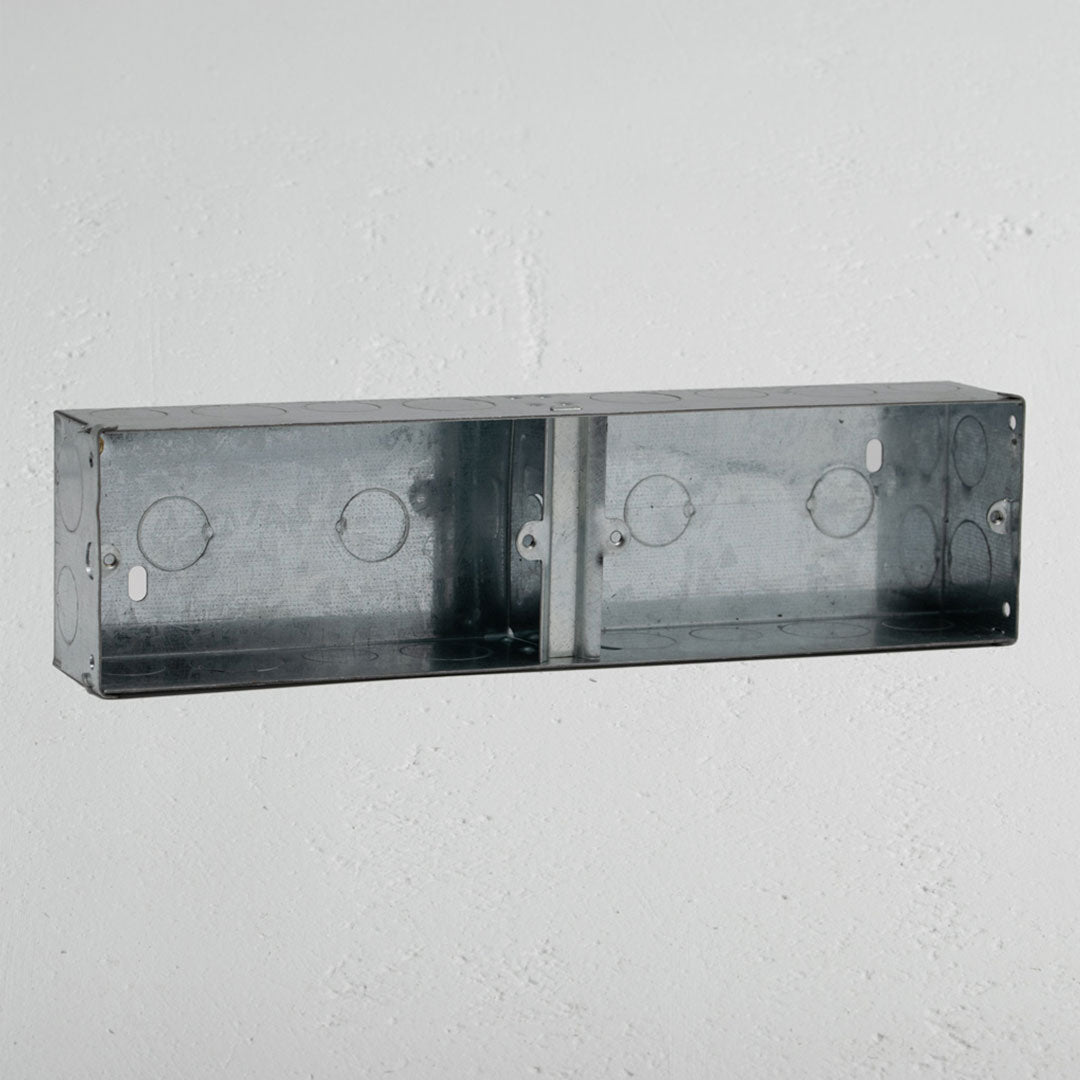 This double 2x landscape back box is made from galvanised metal. It’s for solid walls or where studs are exposed and it’s deep enough to hold all the electrics inside.