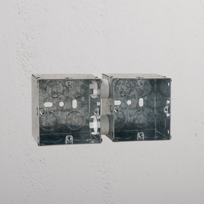 This single 2x back box is made from galvanised metal. It’s for solid walls or where studs are exposed and it’s deep enough to hold all the electrics inside.
