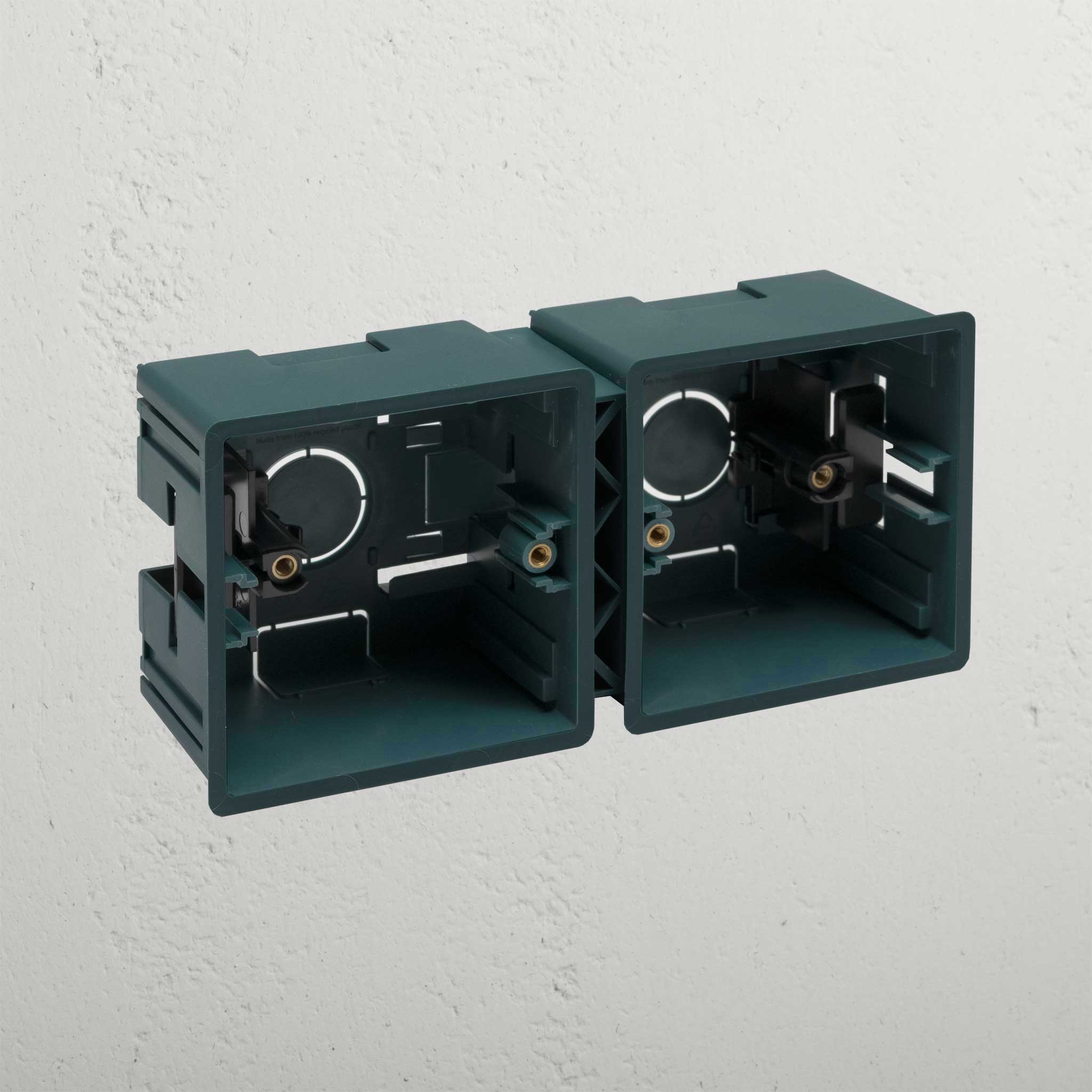 This single 2x back box is made from fully recycled and recyclable post-consumer plastic. It’s for plasterboard cavity walls, so it has tabs and a lip that grip the plasterboard securely.