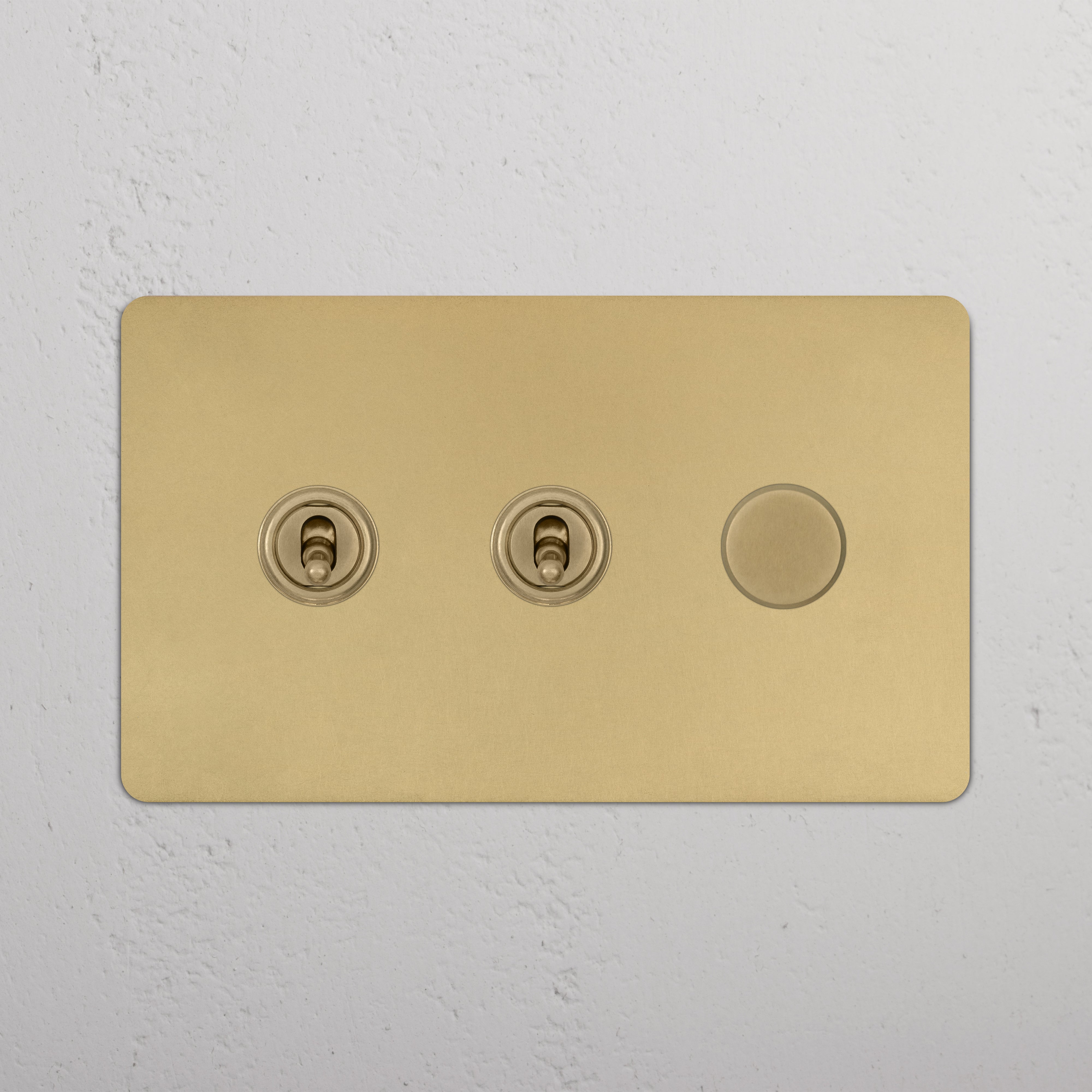 This 3 gang mixed switch combines two two-way toggles and a rotary dimmer on one plate.