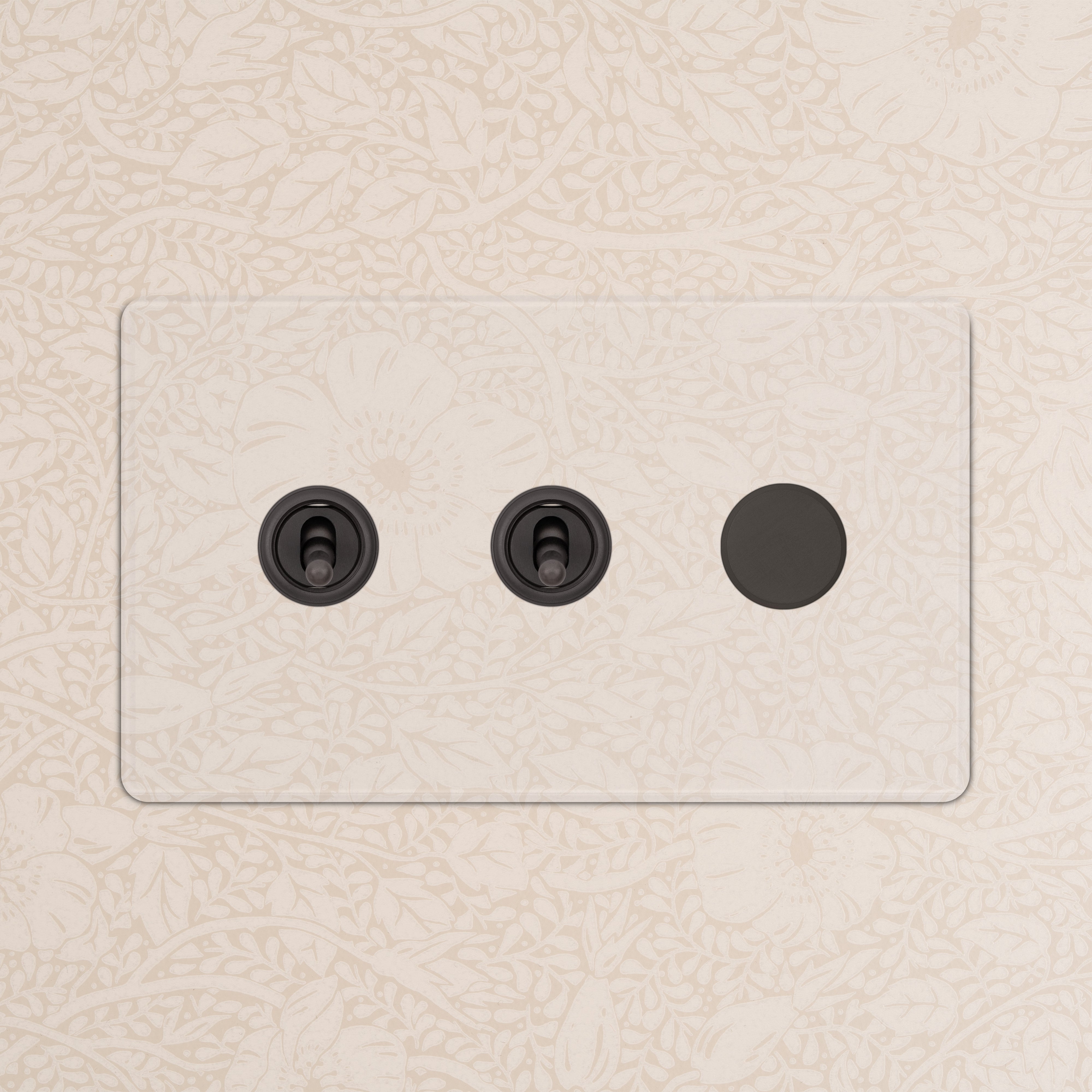 This 3 gang mixed switch combines two two-way toggles and a rotary dimmer on one plate.