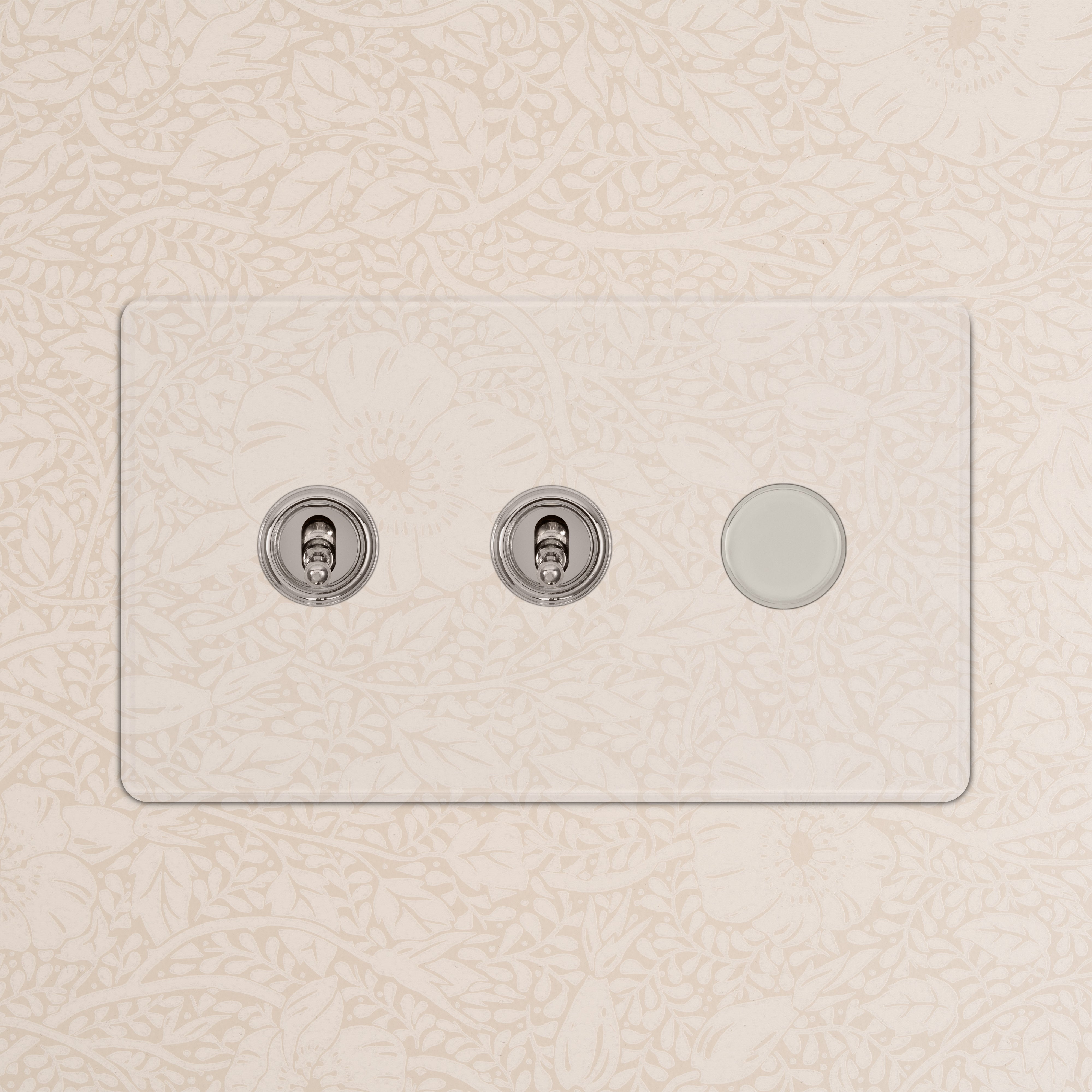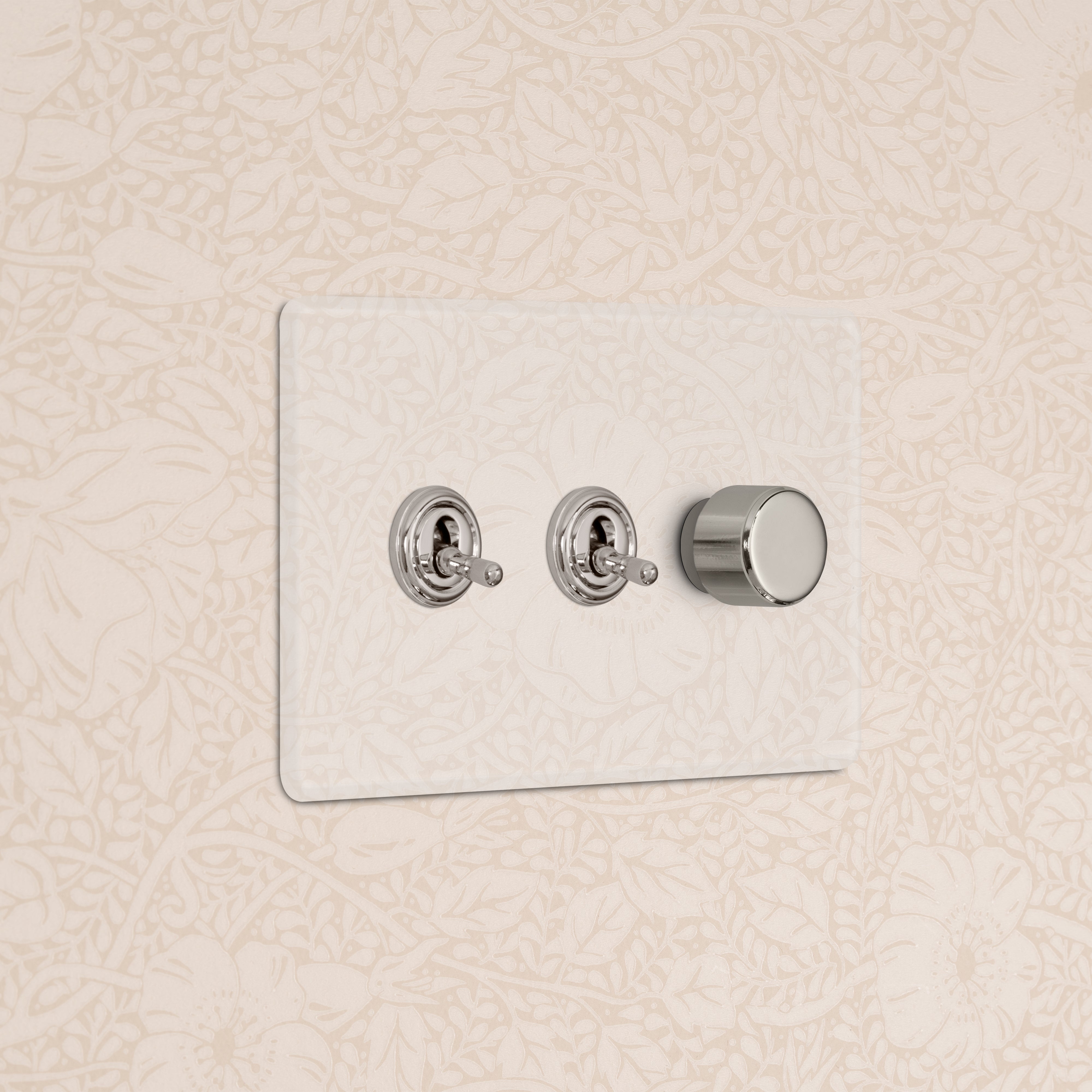 This 3 gang mixed switch combines two two-way toggles and a rotary dimmer on one plate.