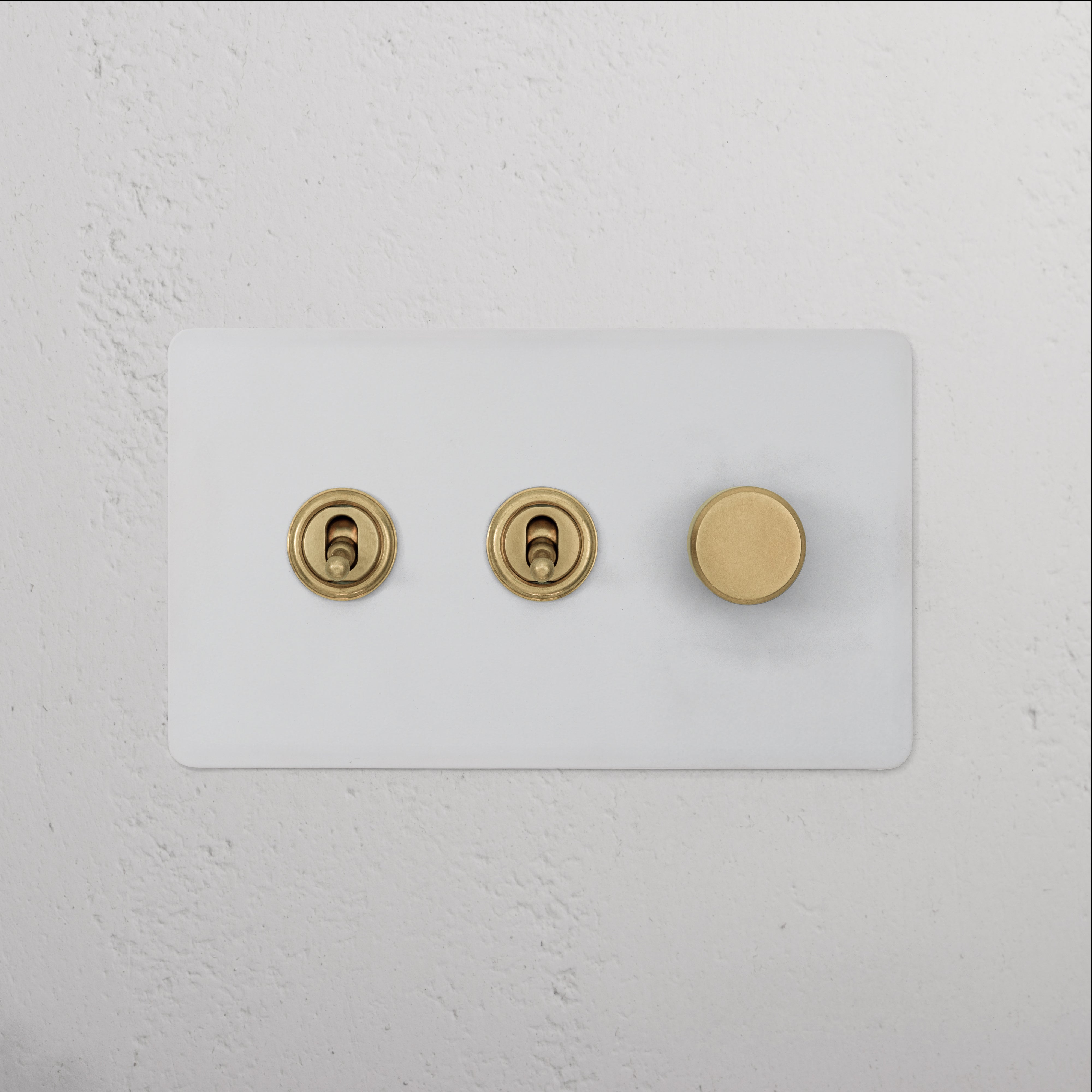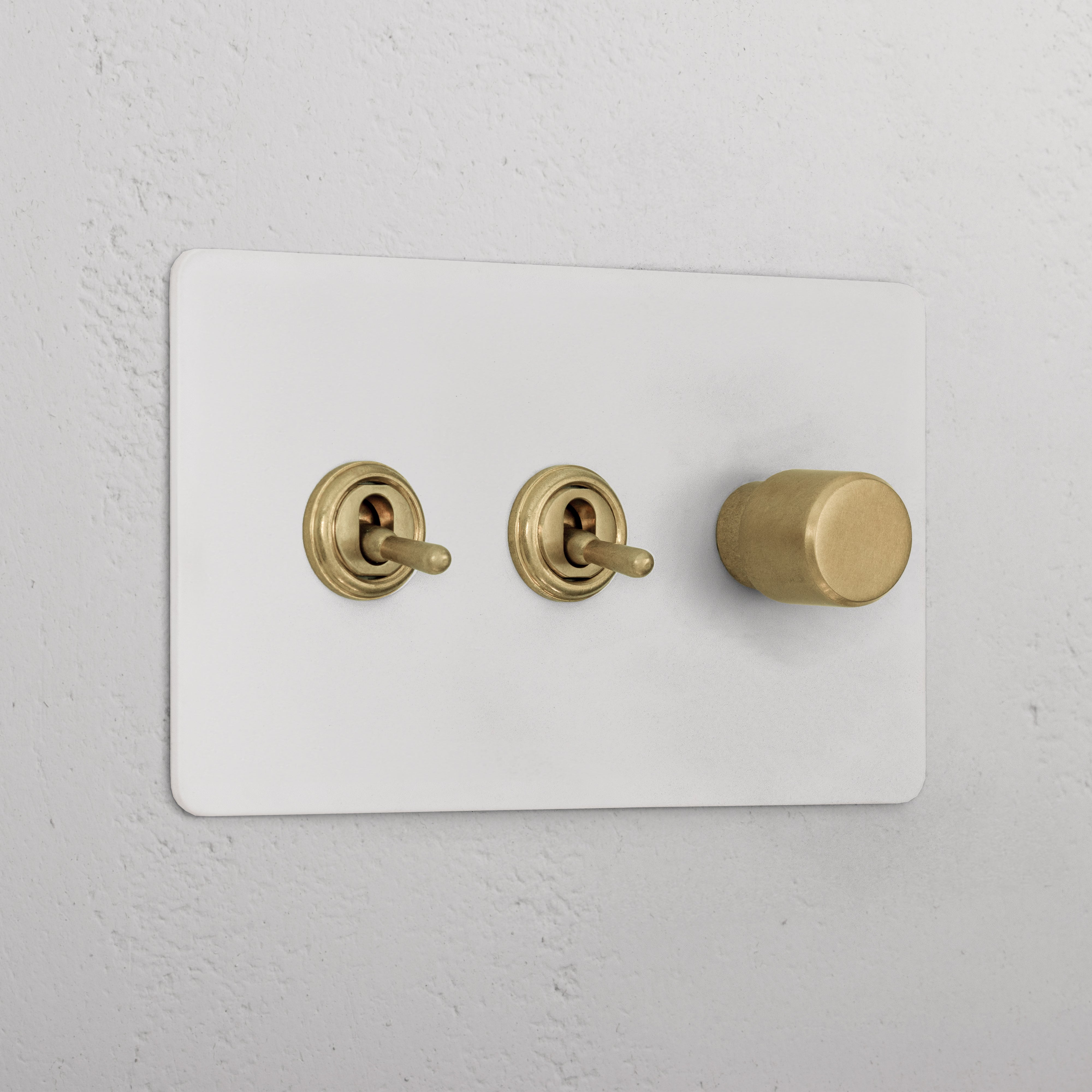 This 3 gang mixed switch combines two two-way toggles and a rotary dimmer on one plate.