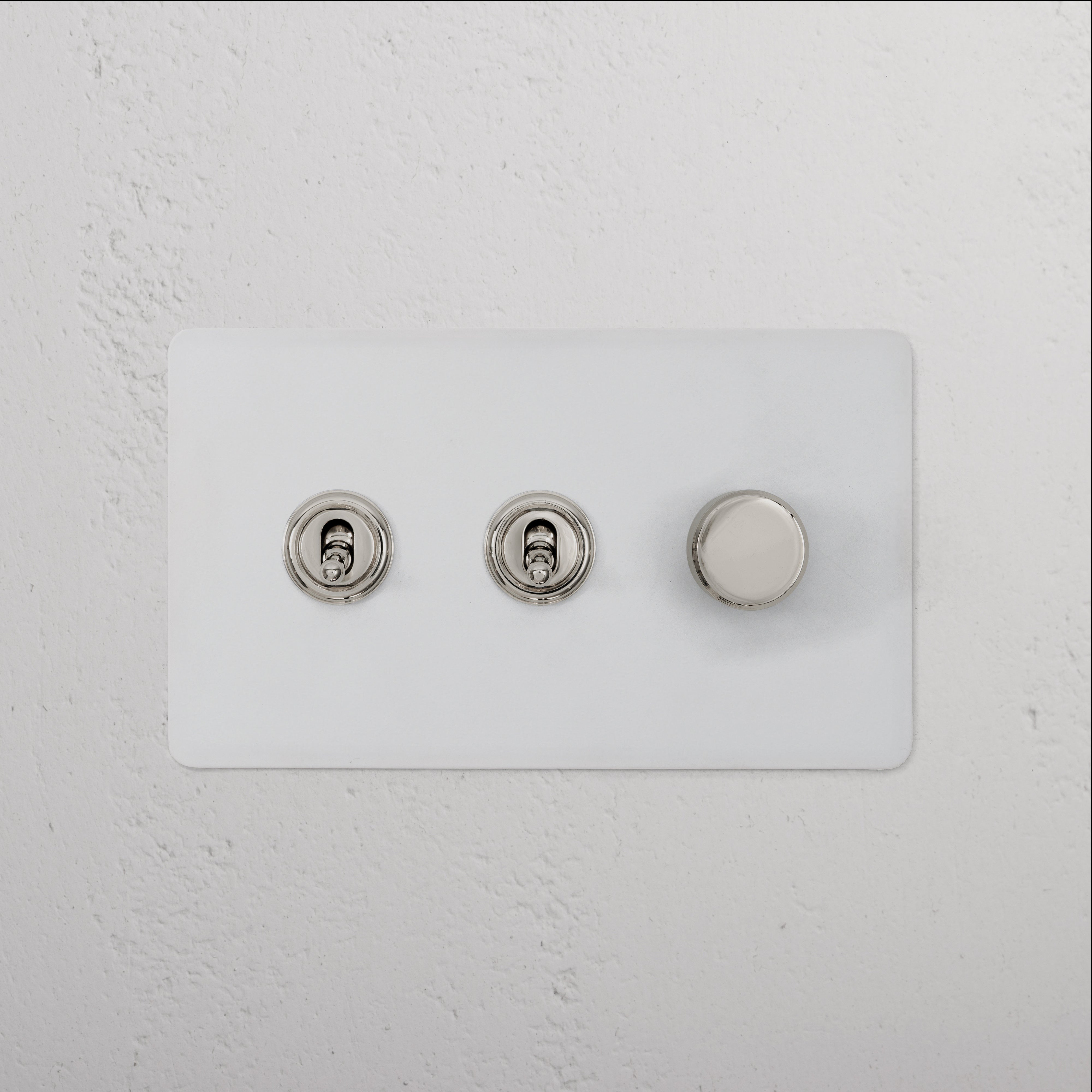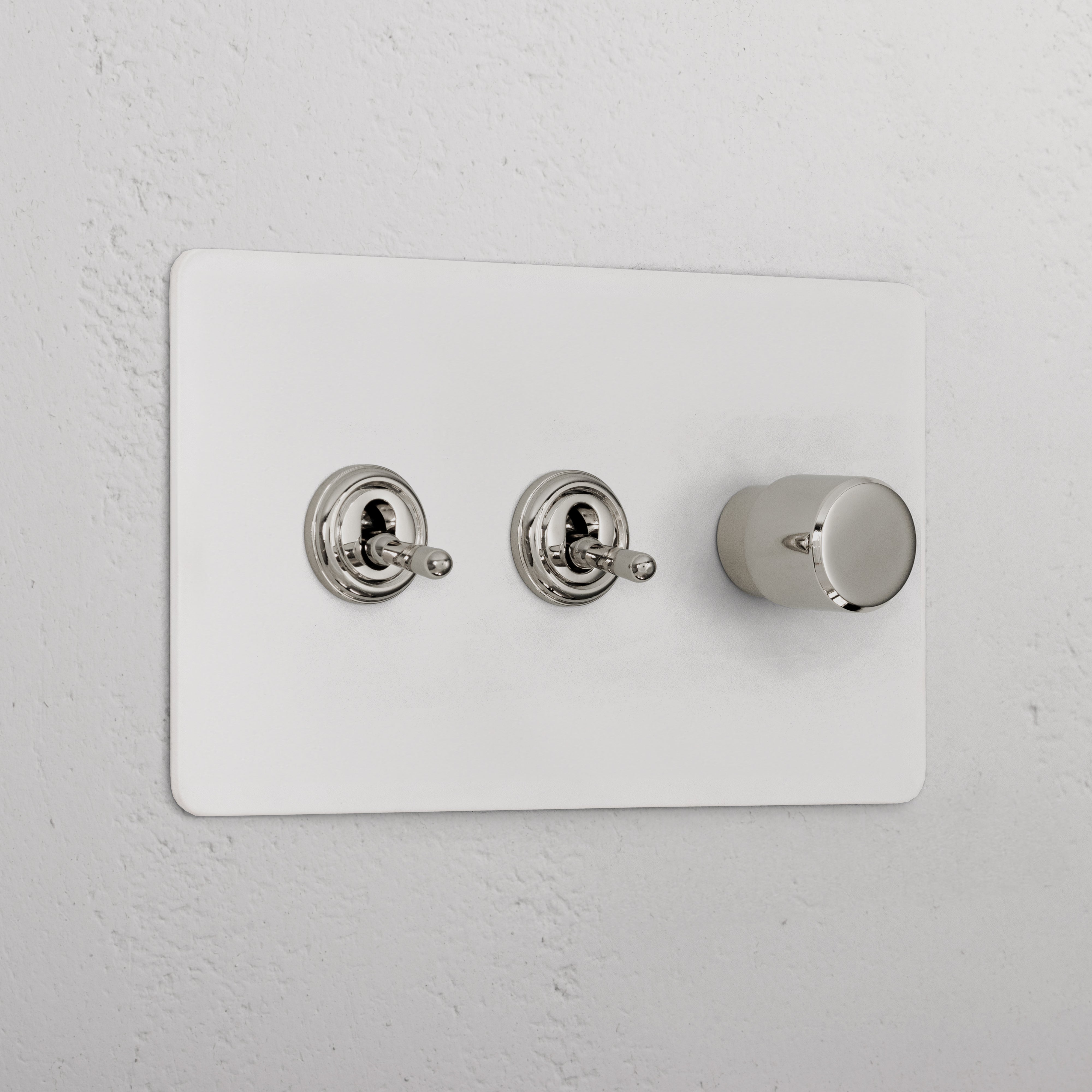 This 3 gang mixed switch combines two two-way toggles and a rotary dimmer on one plate.