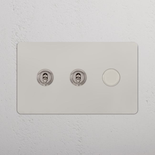 This 3 gang mixed switch combines two two-way toggles and a rotary dimmer on one plate.