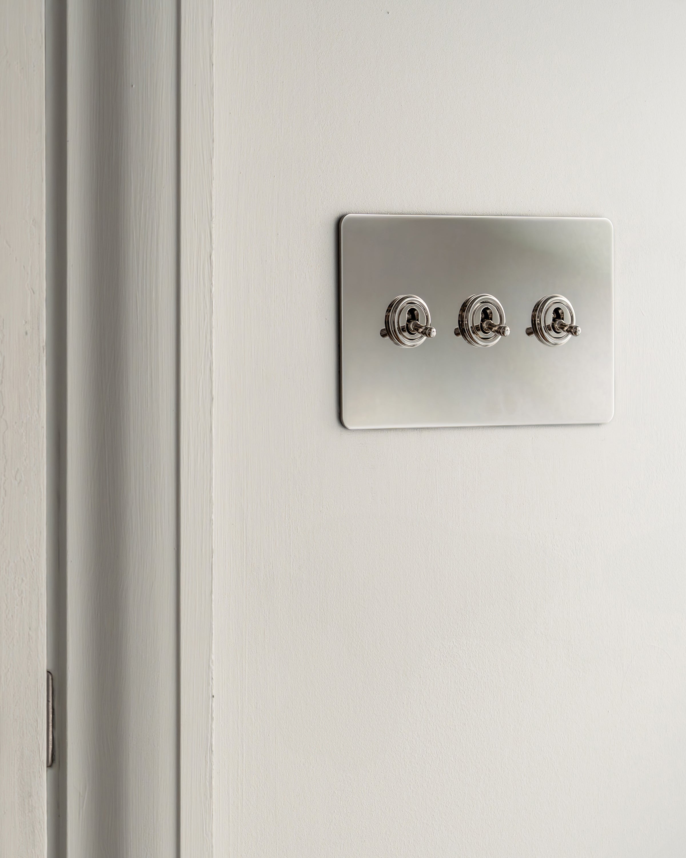 Our 3 gang two-way toggle switch is a modern take on the classic dolly design. We’ve crafted it to be as sleek and timeless as possible in any interior setting.