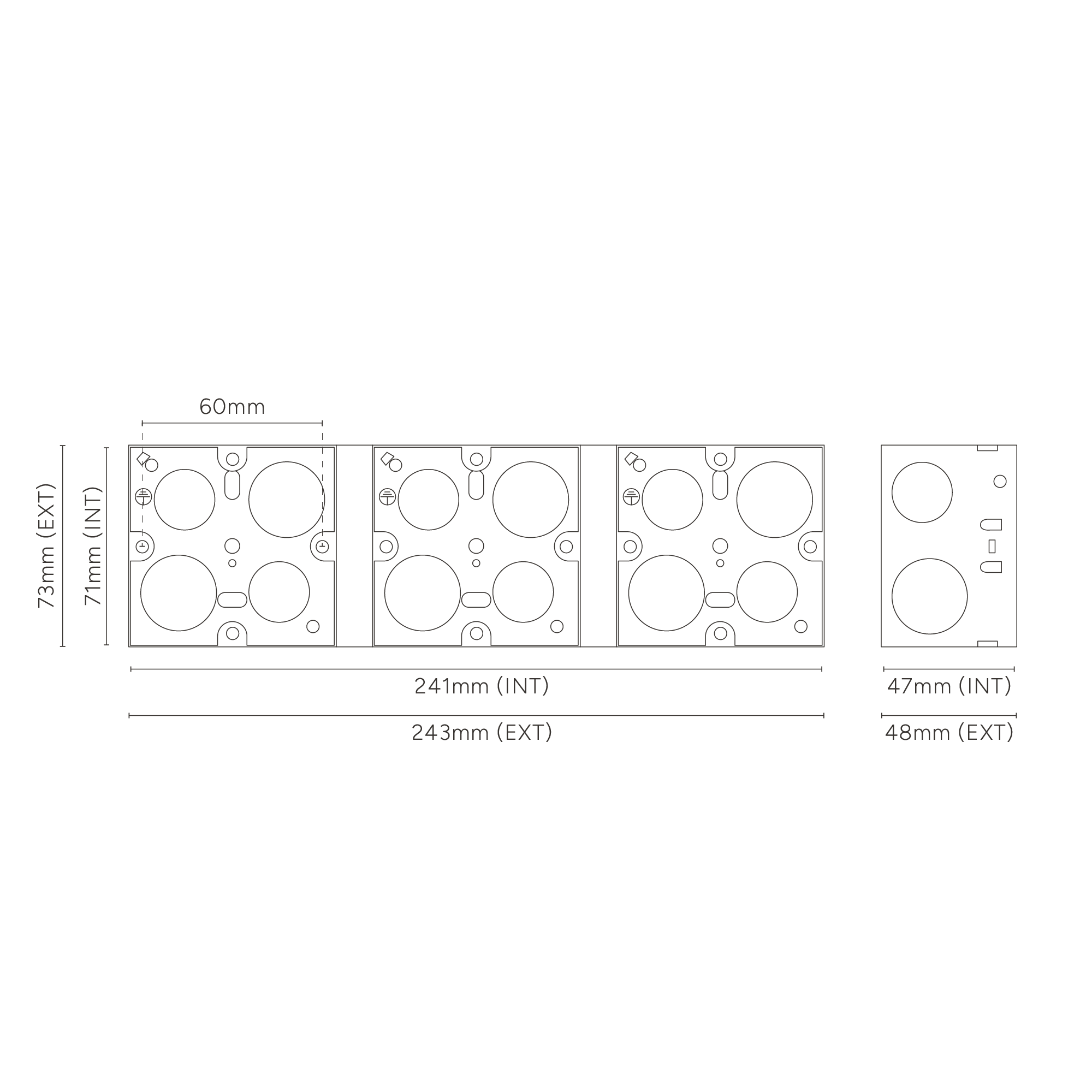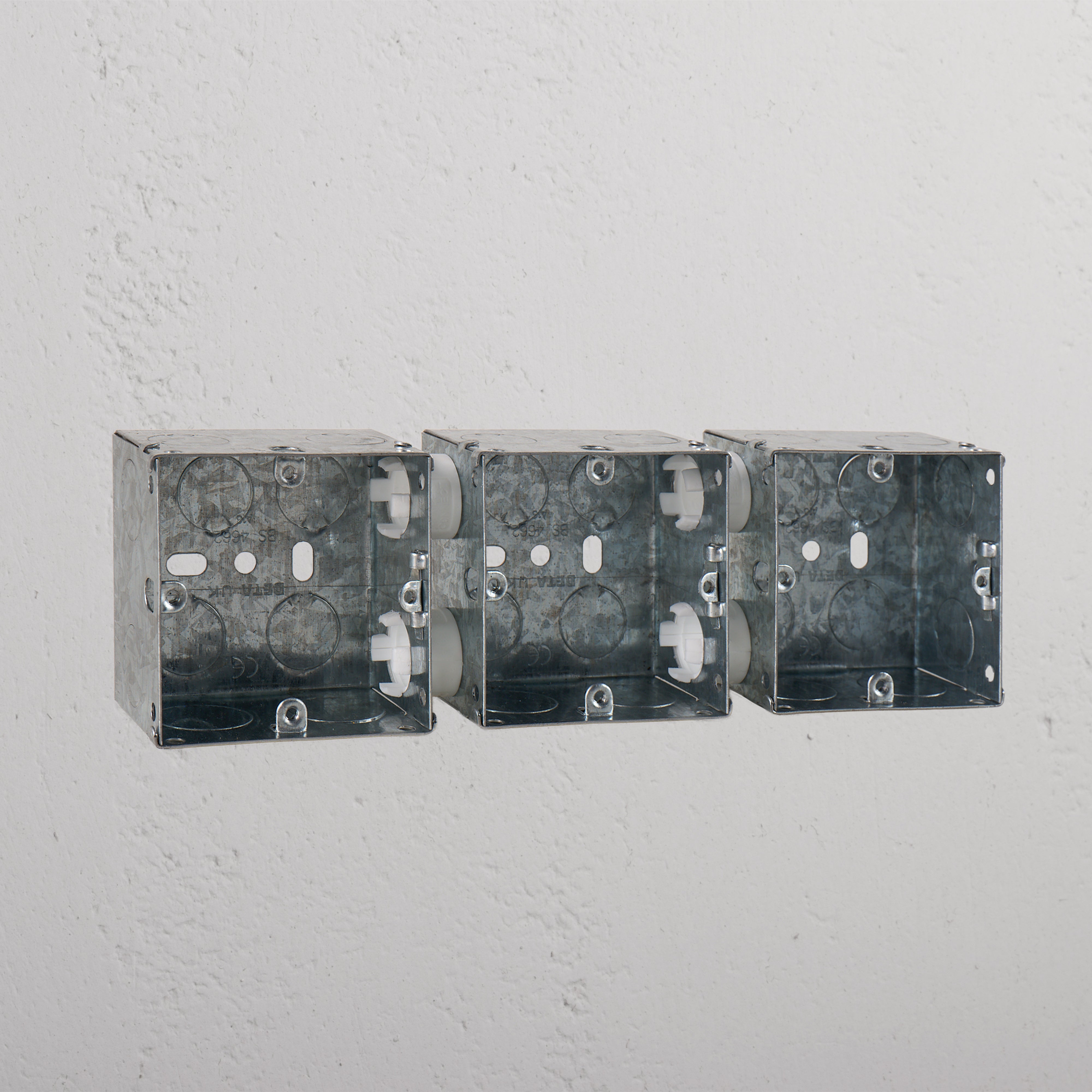 This single 3x back box is made from galvanised metal. It’s for solid walls or where studs are exposed and it’s deep enough to hold all the electrics inside.