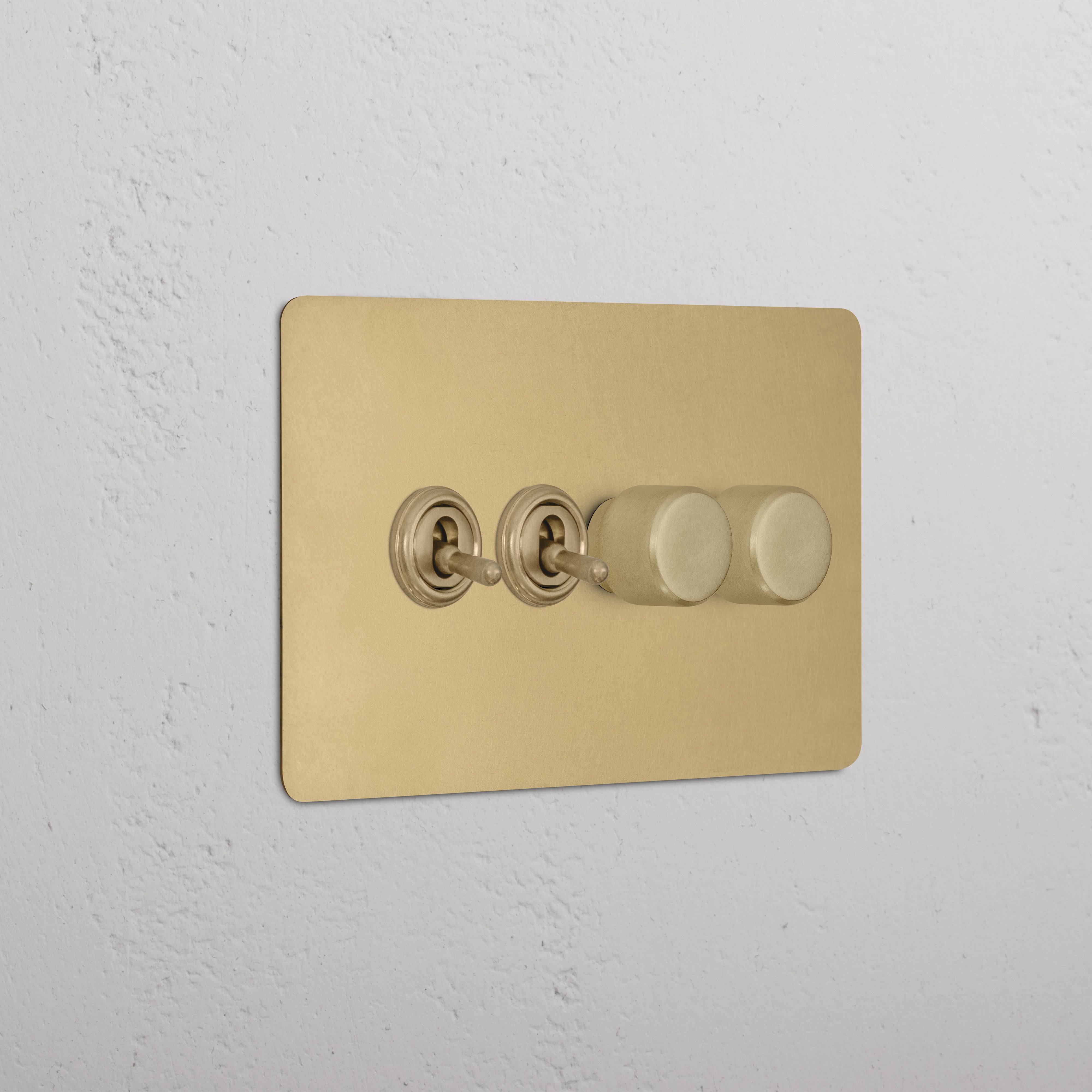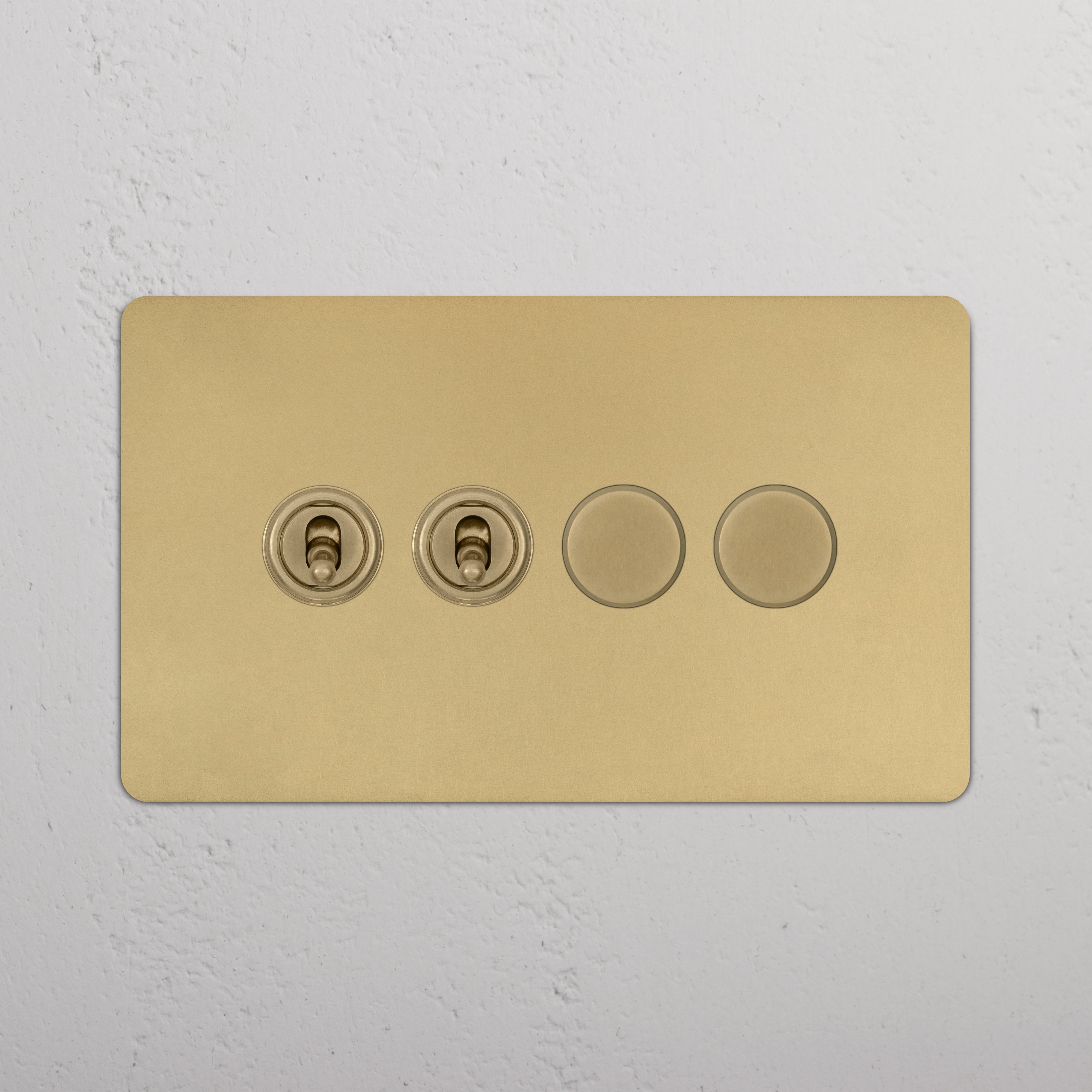 This 4 gang mixed switch combines two two-way toggles and two rotary dimmers on one plate.
