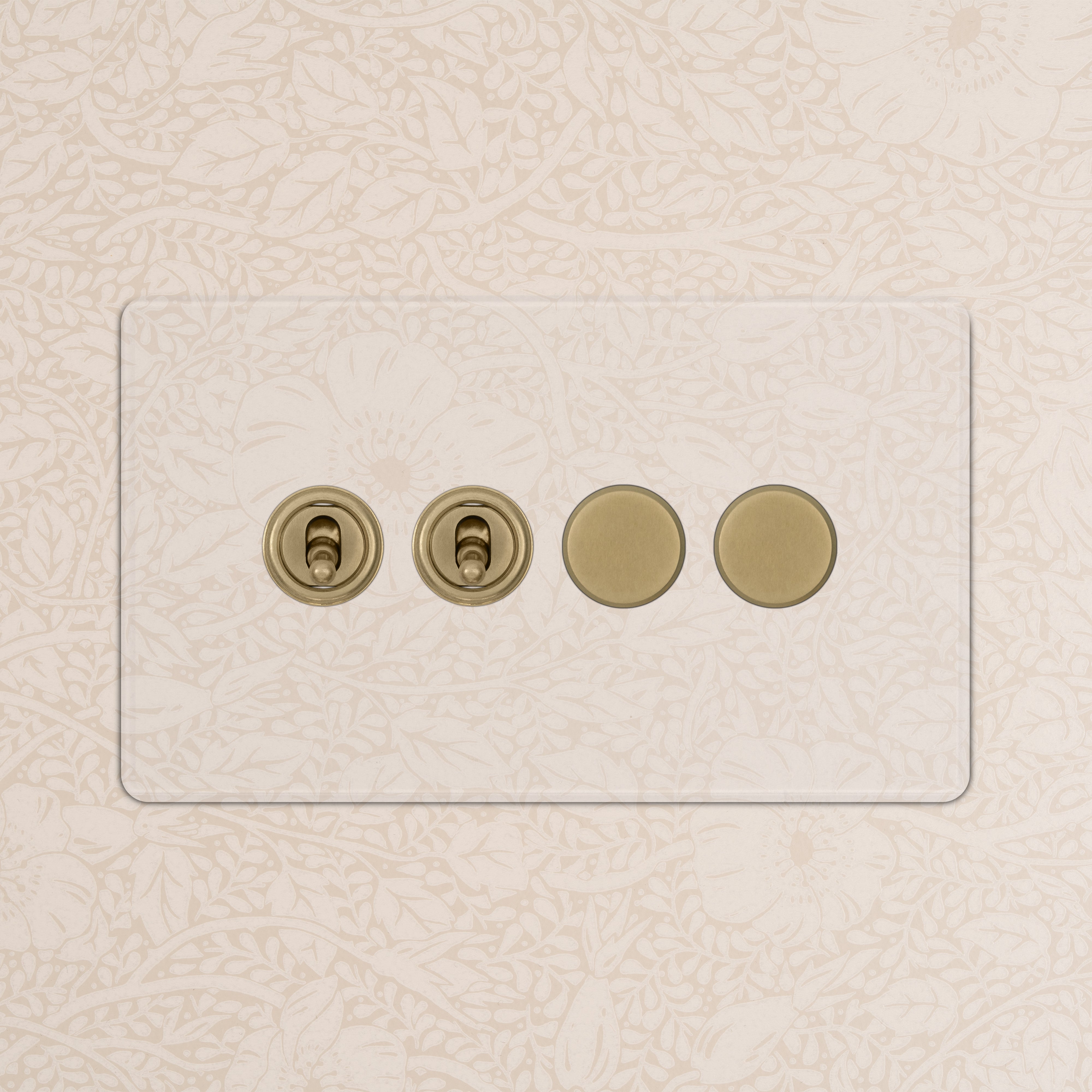 This 4 gang mixed switch combines two two-way toggles and two rotary dimmers on one plate.