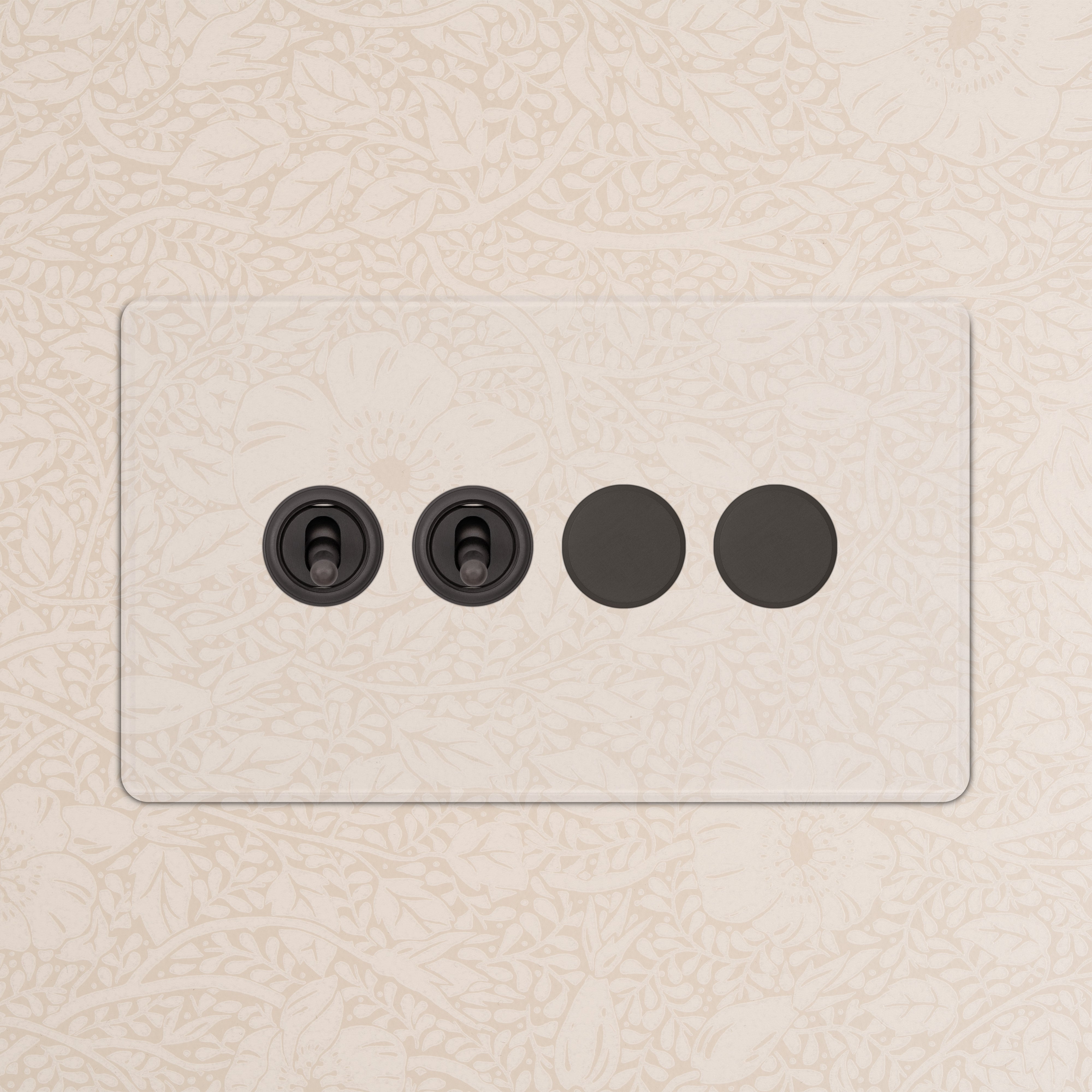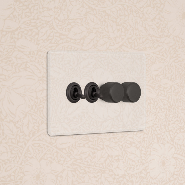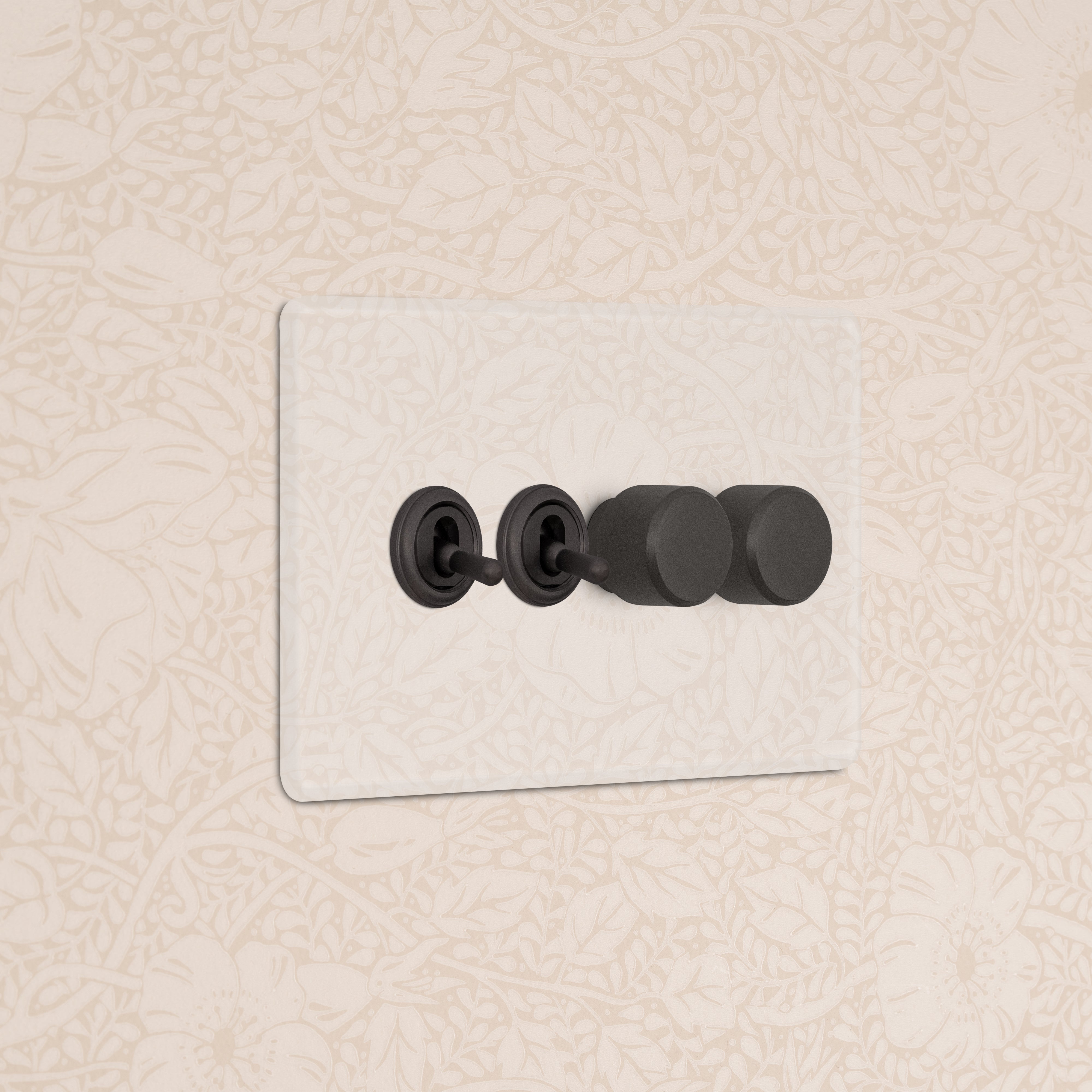 This 4 gang mixed switch combines two two-way toggles and two rotary dimmers on one plate.