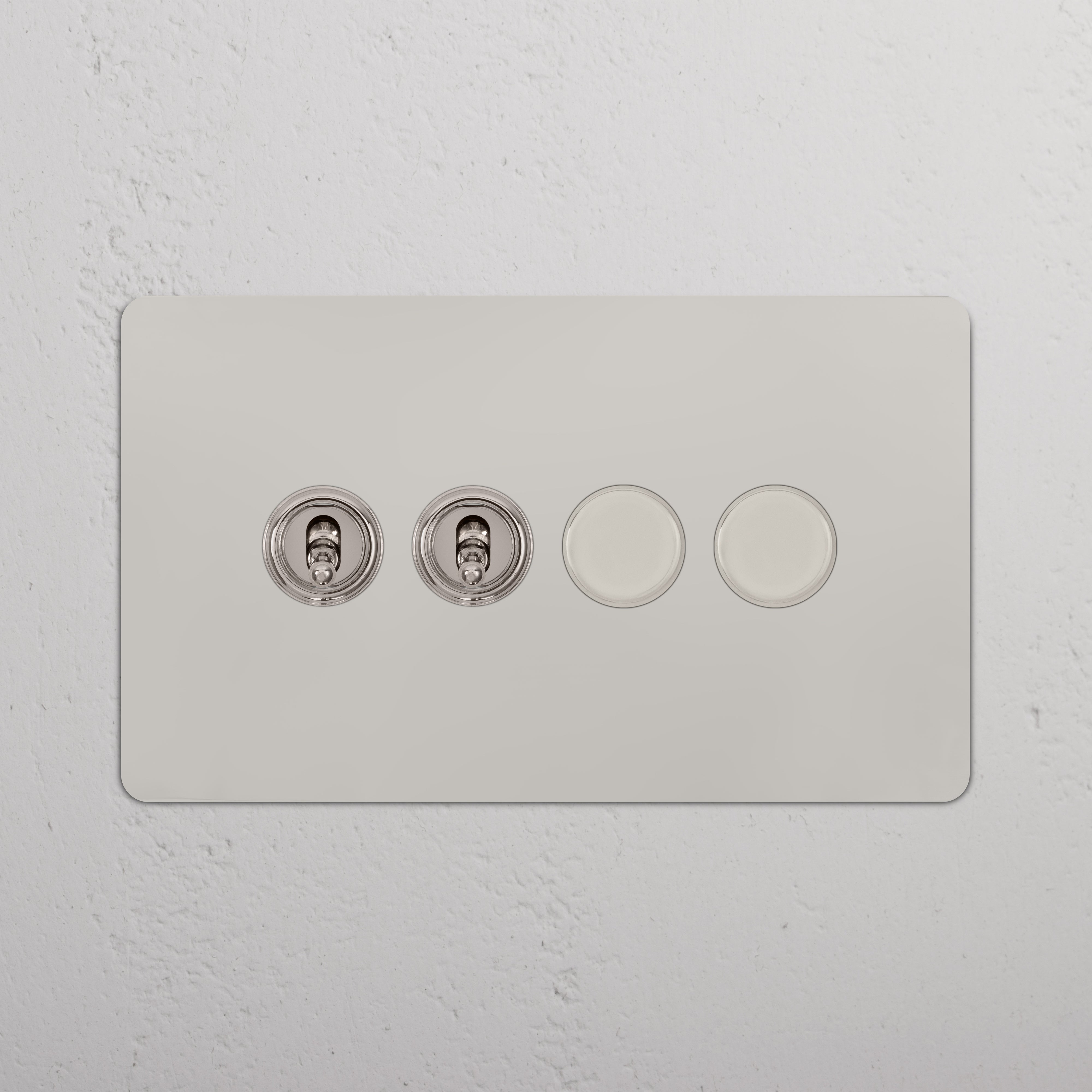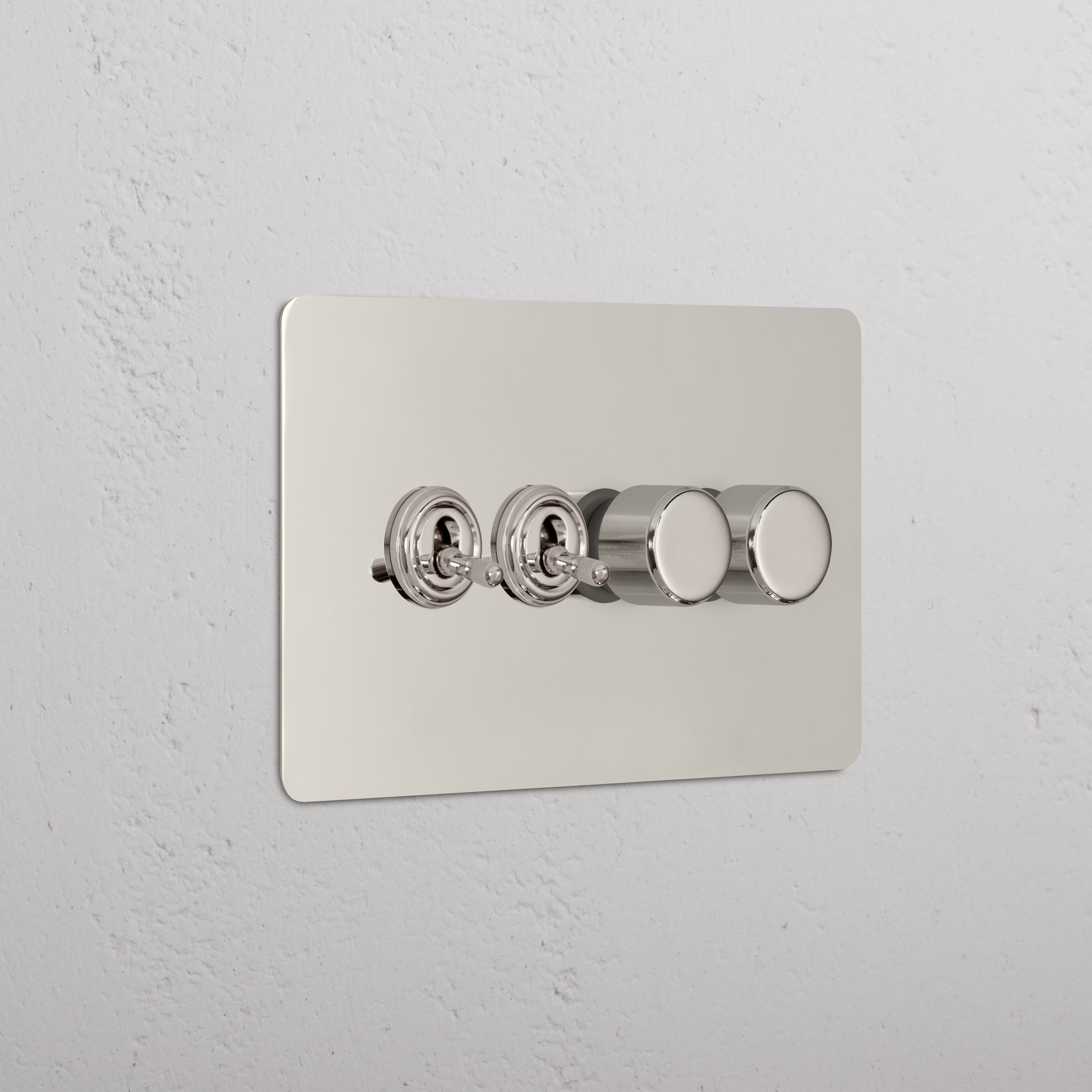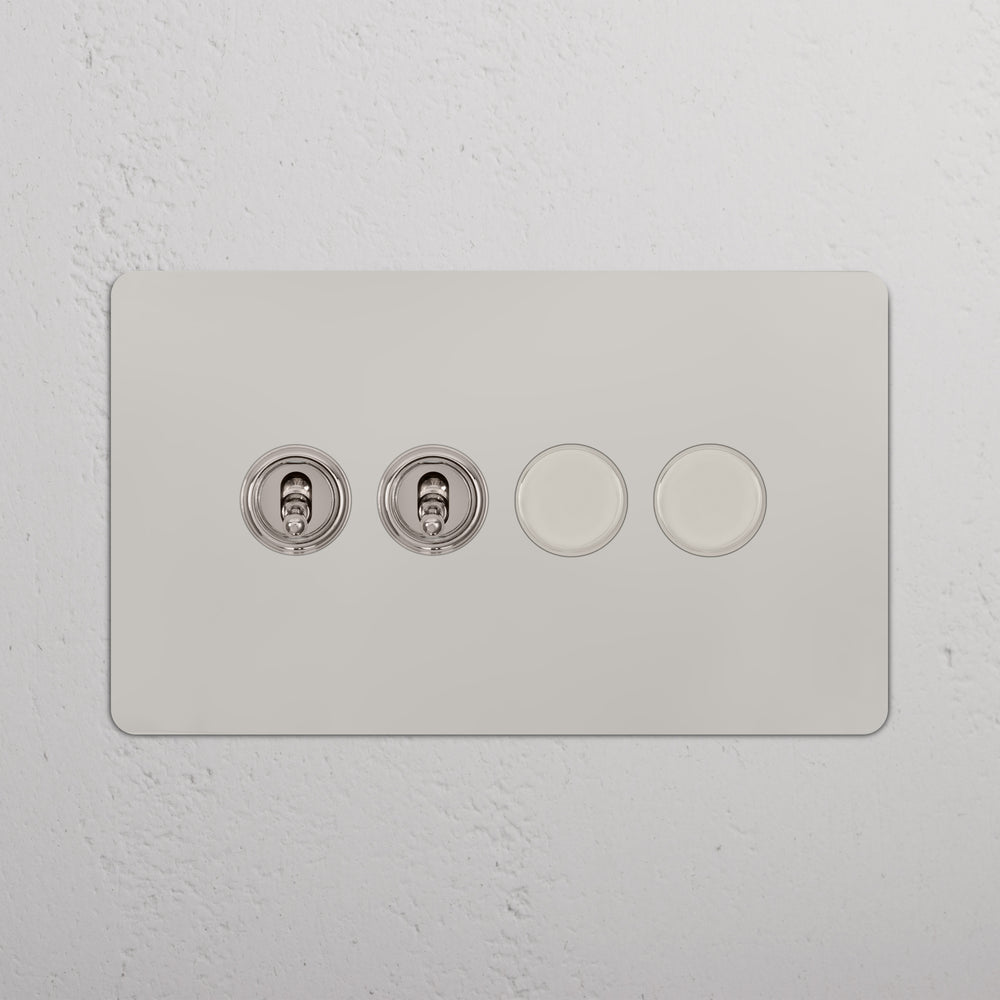 This 4 gang mixed switch combines two two-way toggles and two rotary dimmers on one plate.