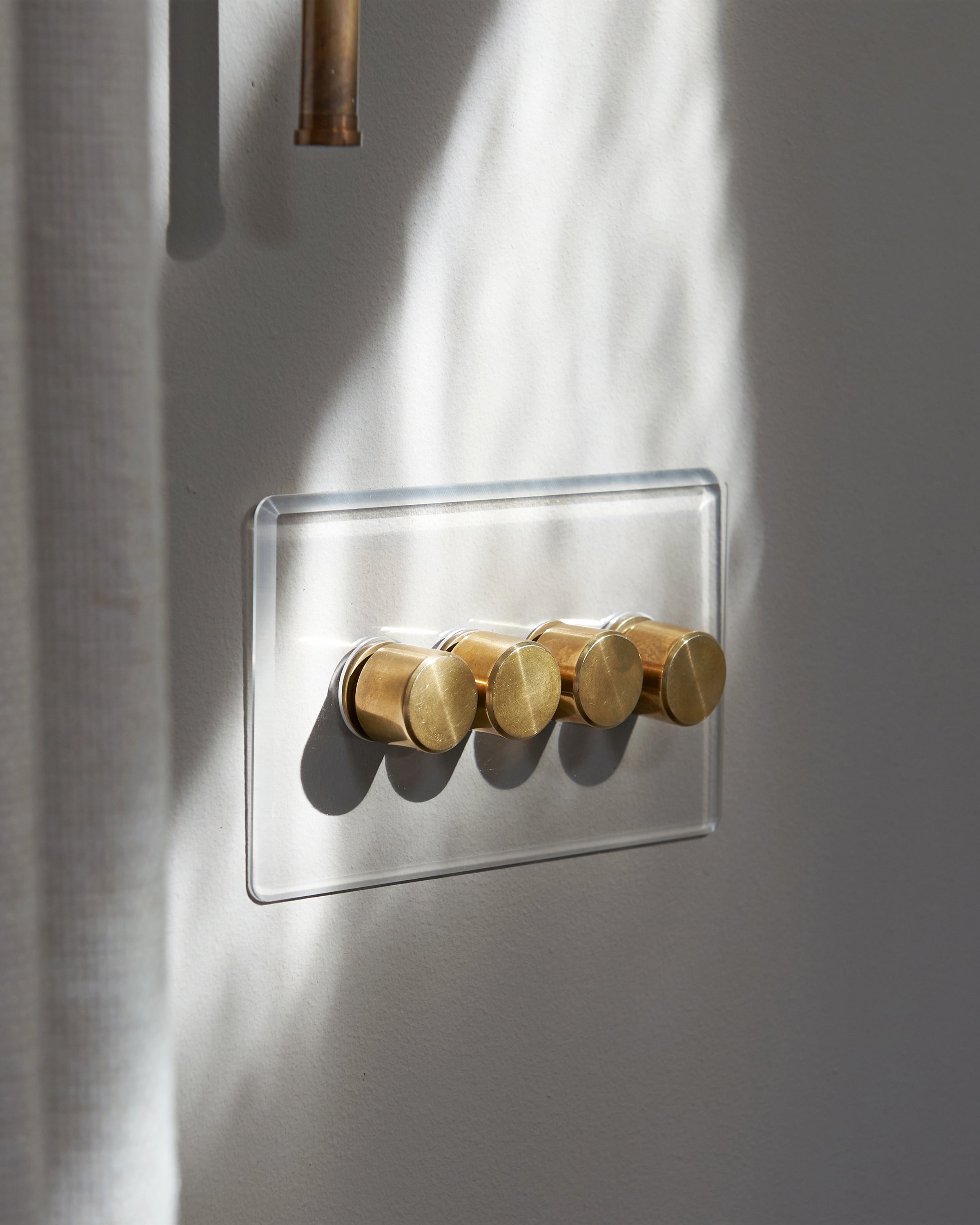 We make our clear collection from polycarbonate, which is more flexible and durable than the usual acrylic. The dimmers are made from antiqued solid brass.