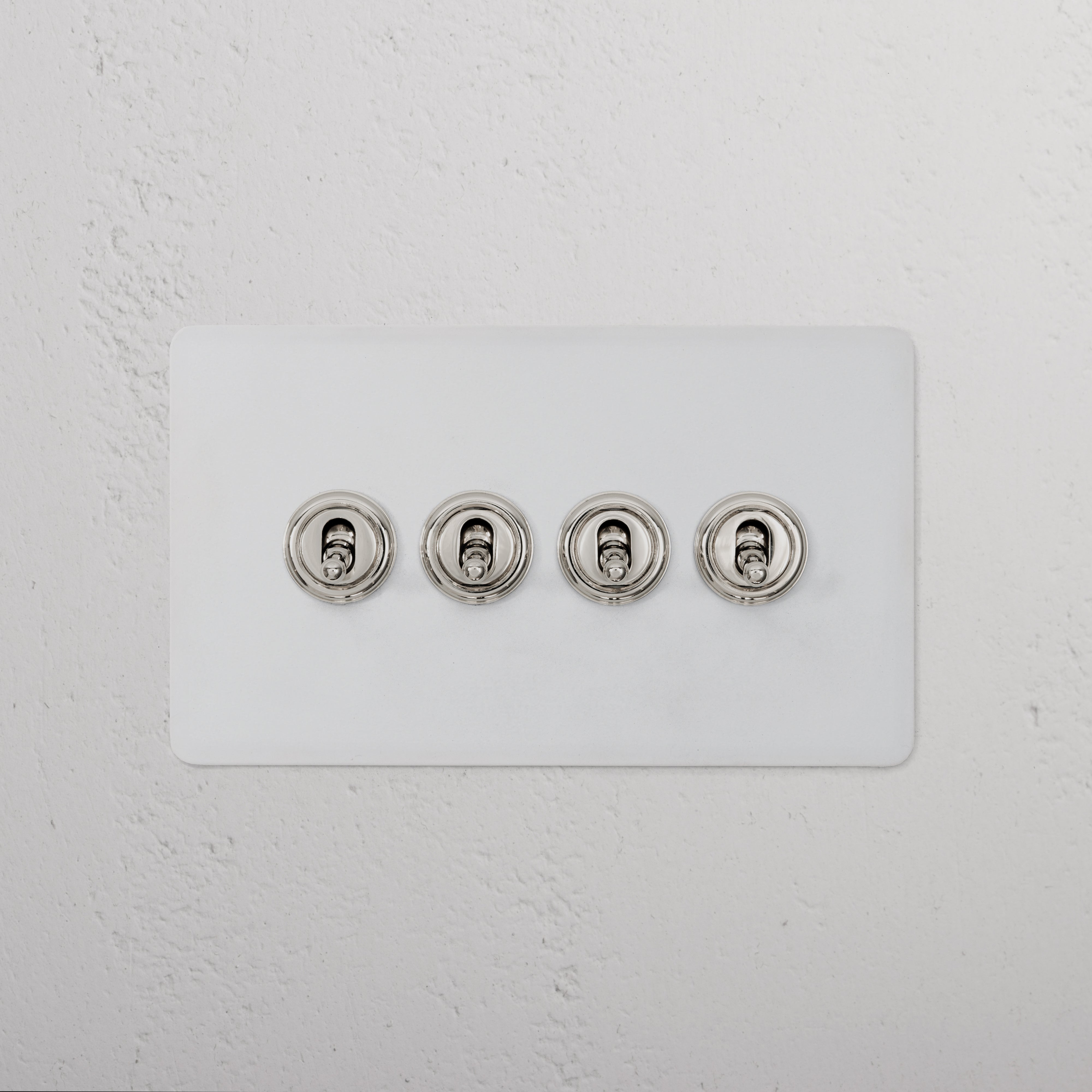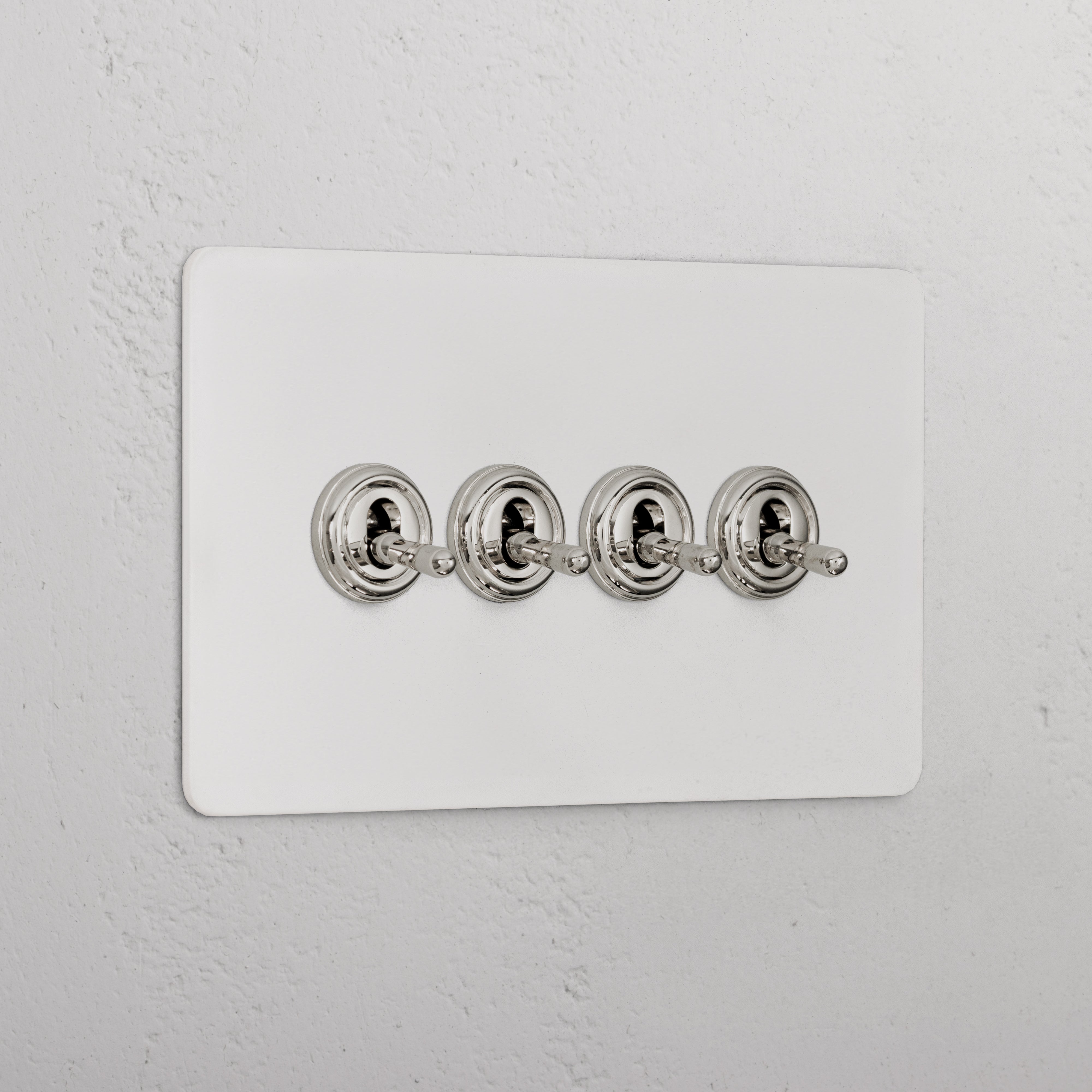 Our 4 gang two-way toggle switch is a modern take on the classic dolly design. We’ve crafted it to be as sleek and timeless as possible in any interior setting.
