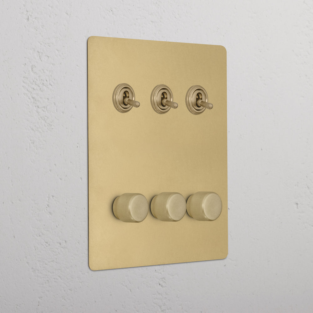 This 6 gang mixed switch combines three two-way toggles and three rotary dimmers on one plate.