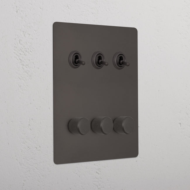 This 6 gang mixed switch combines three two-way toggles and three rotary dimmers on one plate.