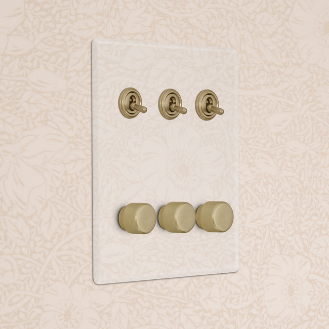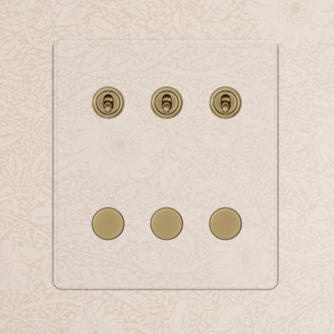 This 6 gang mixed switch combines three two-way toggles and three rotary dimmers on one plate.