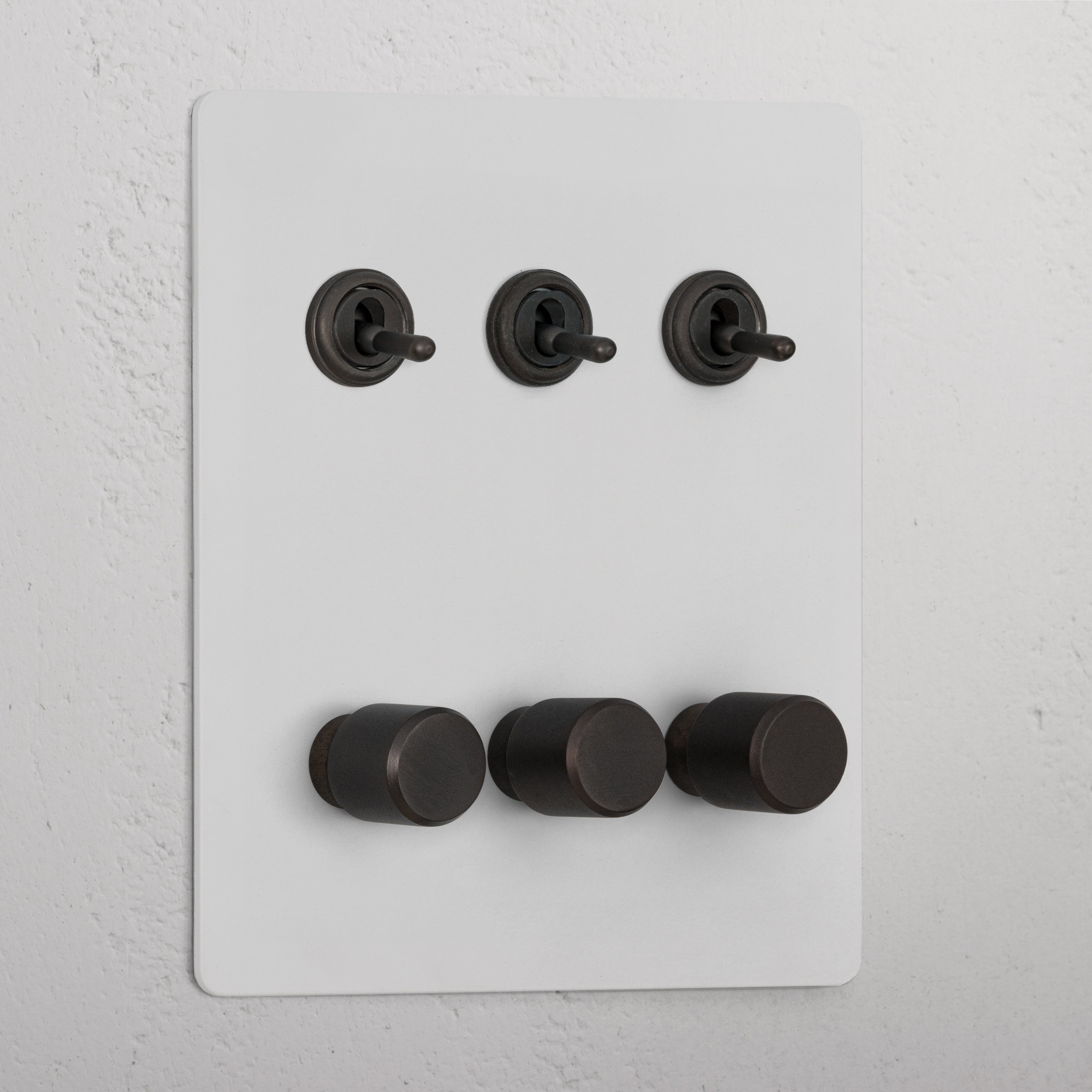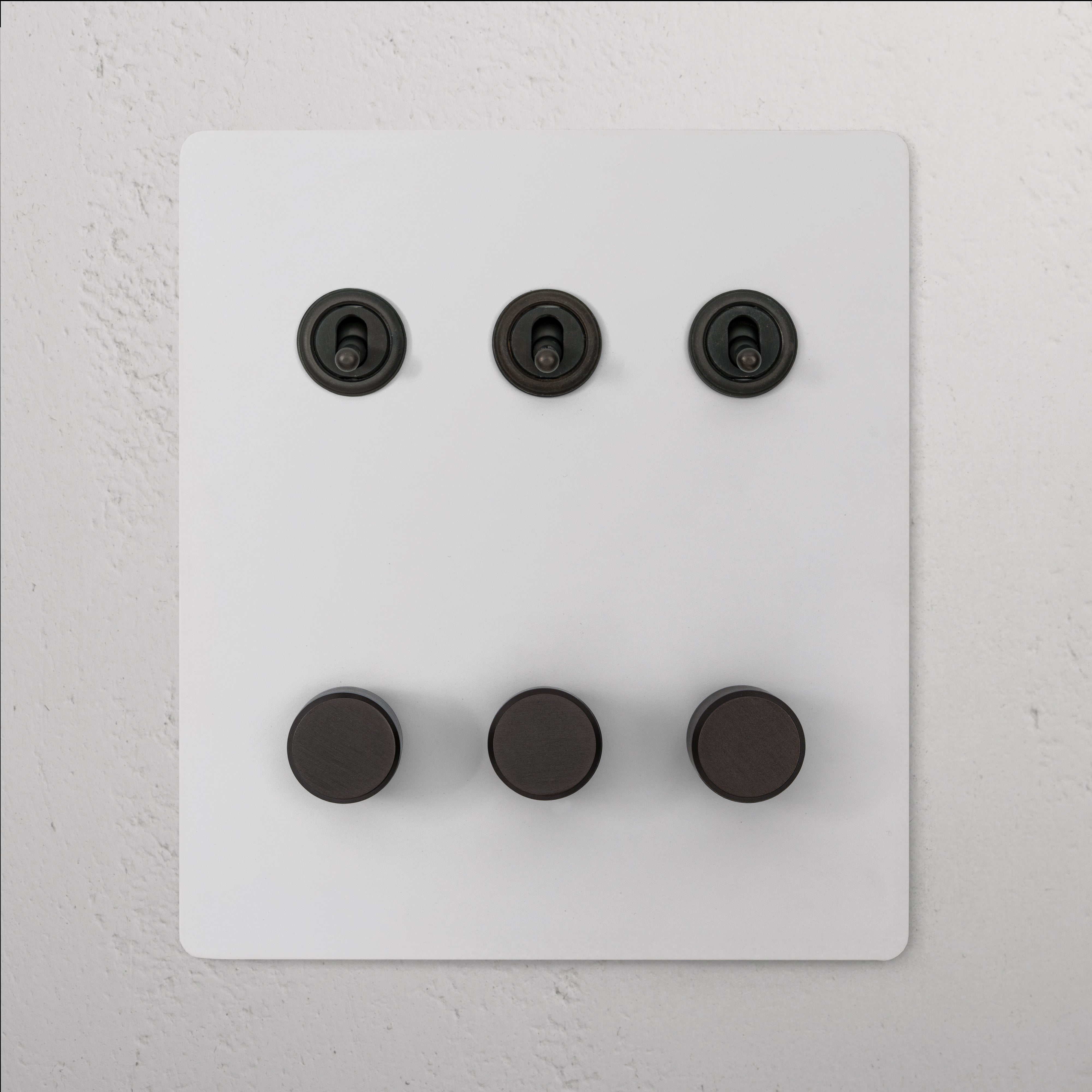 This 6 gang mixed switch combines three two-way toggles and three rotary dimmers on one plate.