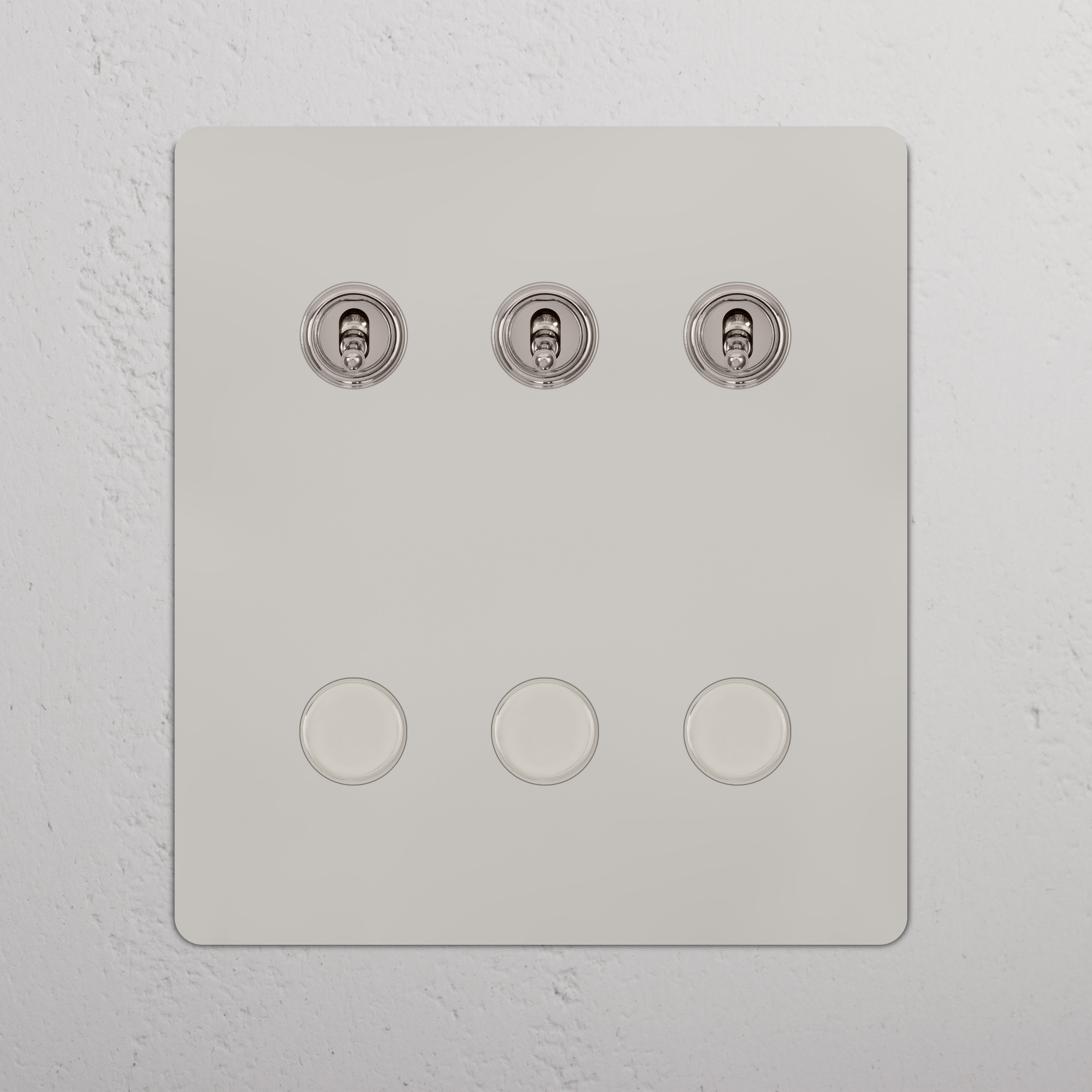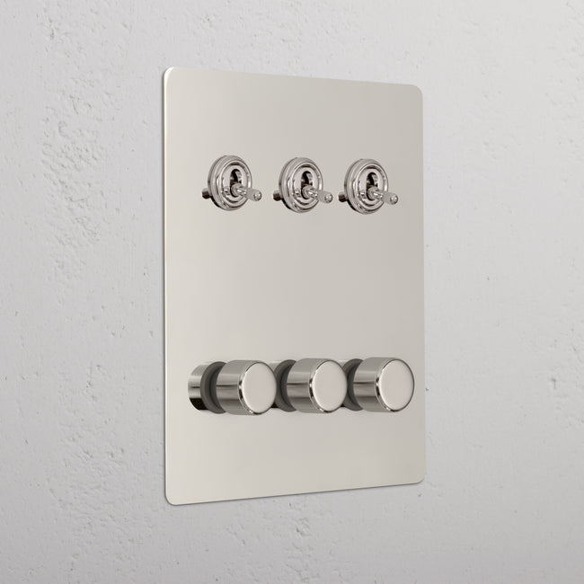 This 6 gang mixed switch combines three two-way toggles and three rotary dimmers on one plate.