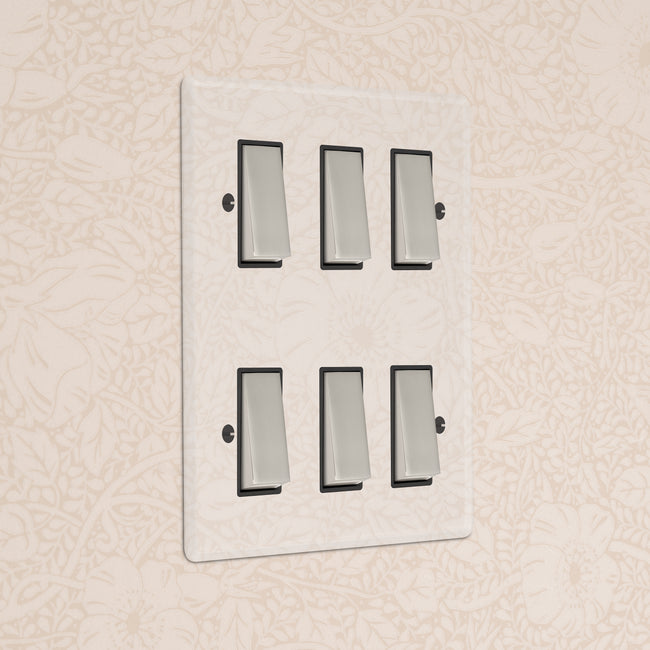 Our 6 gang two-way rocker switch is crafted to be as sleek and timeless as possible in any interior setting.