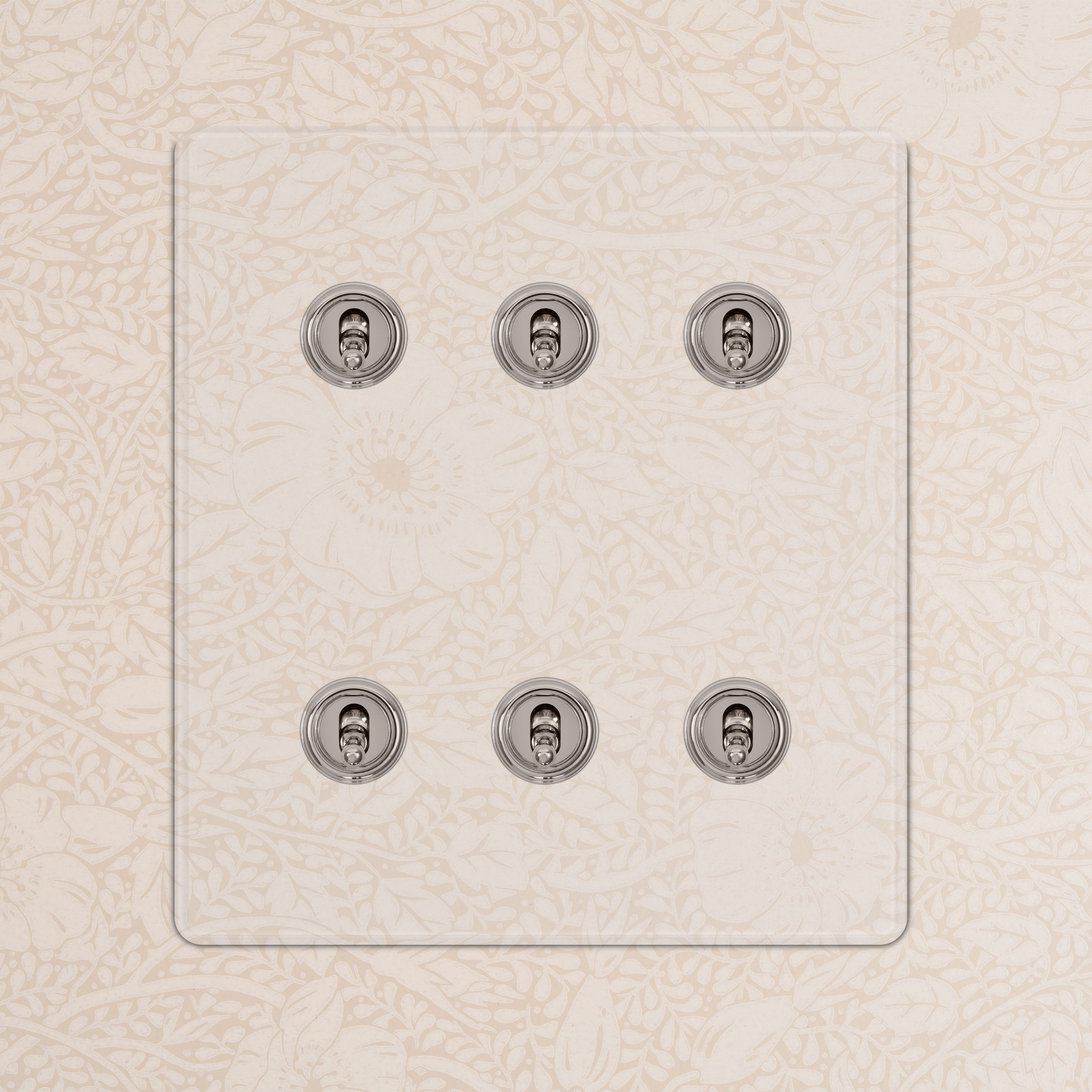 Our 6 gang two-way toggle switch is a modern take on the classic dolly design. We’ve crafted it to be as sleek and timeless as possible in any interior setting.