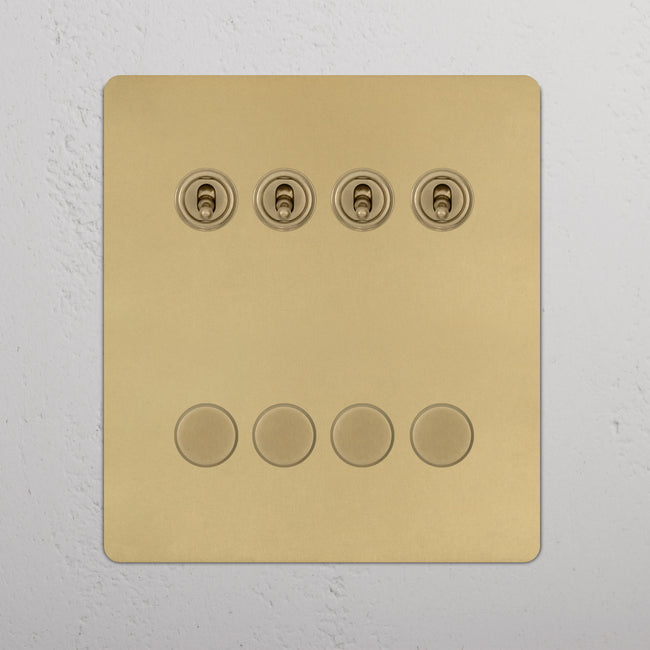 This 8 gang mixed switch combines four two-way toggles and four rotary dimmers on one plate.
