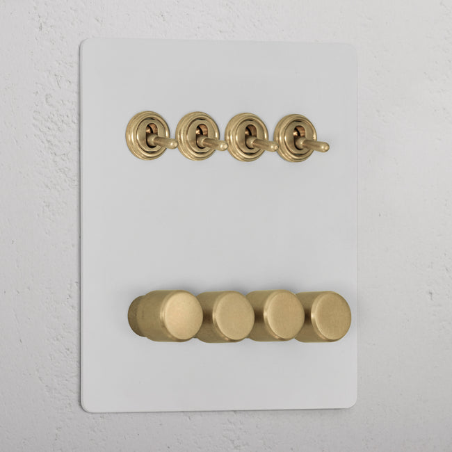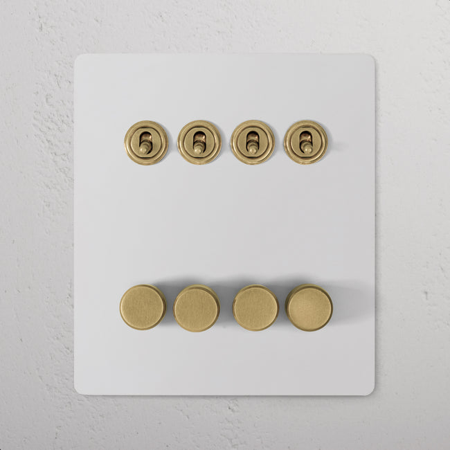 This 8 gang mixed switch combines four two-way toggles and four rotary dimmers on one plate.