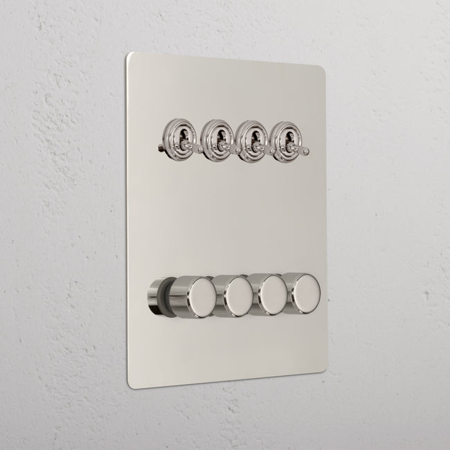 This 8 gang mixed switch combines four two-way toggles and four rotary dimmers on one plate.