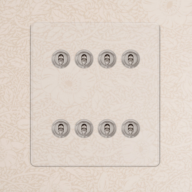 Our 8 gang two-way toggle switch is a modern take on the classic dolly design. We’ve crafted it to be as sleek and timeless as possible in any interior setting.