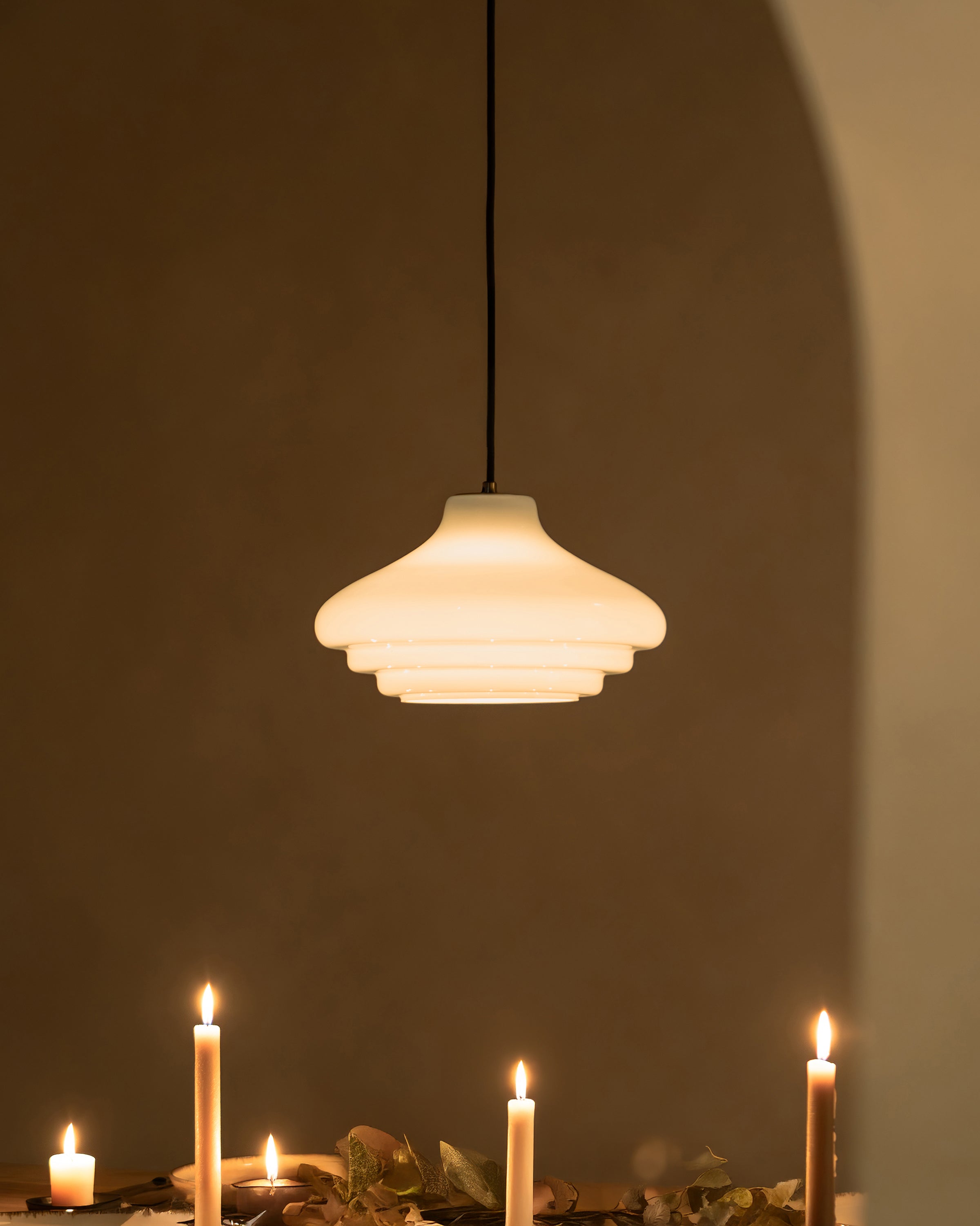 The milky white opal glass is glossier than fine porcelain, but the light it emits is just as warm, atmospheric and free from glare.