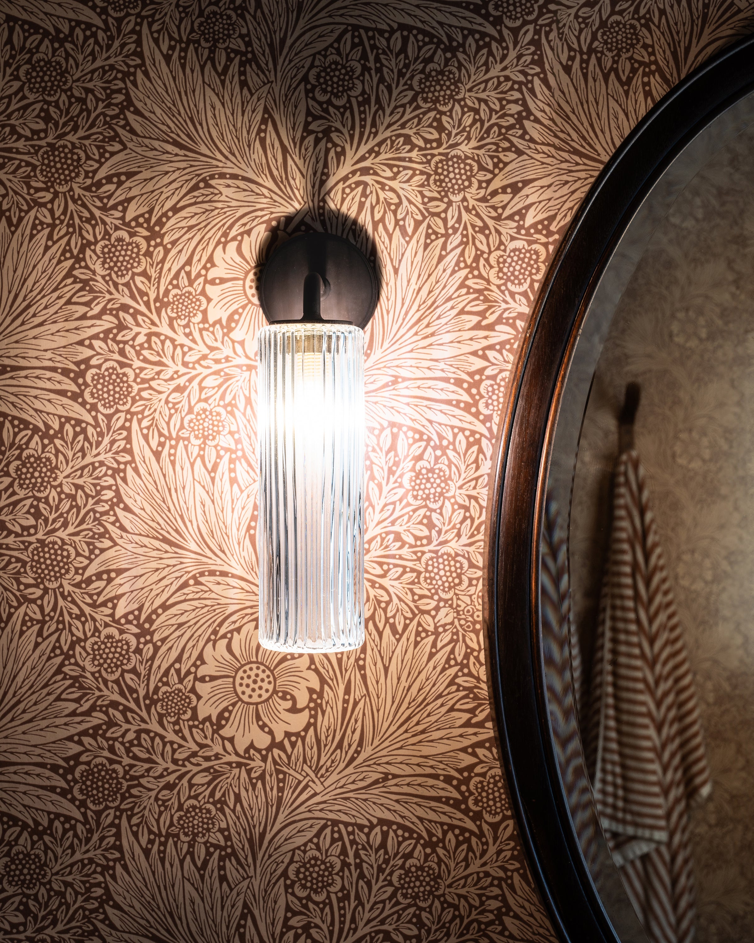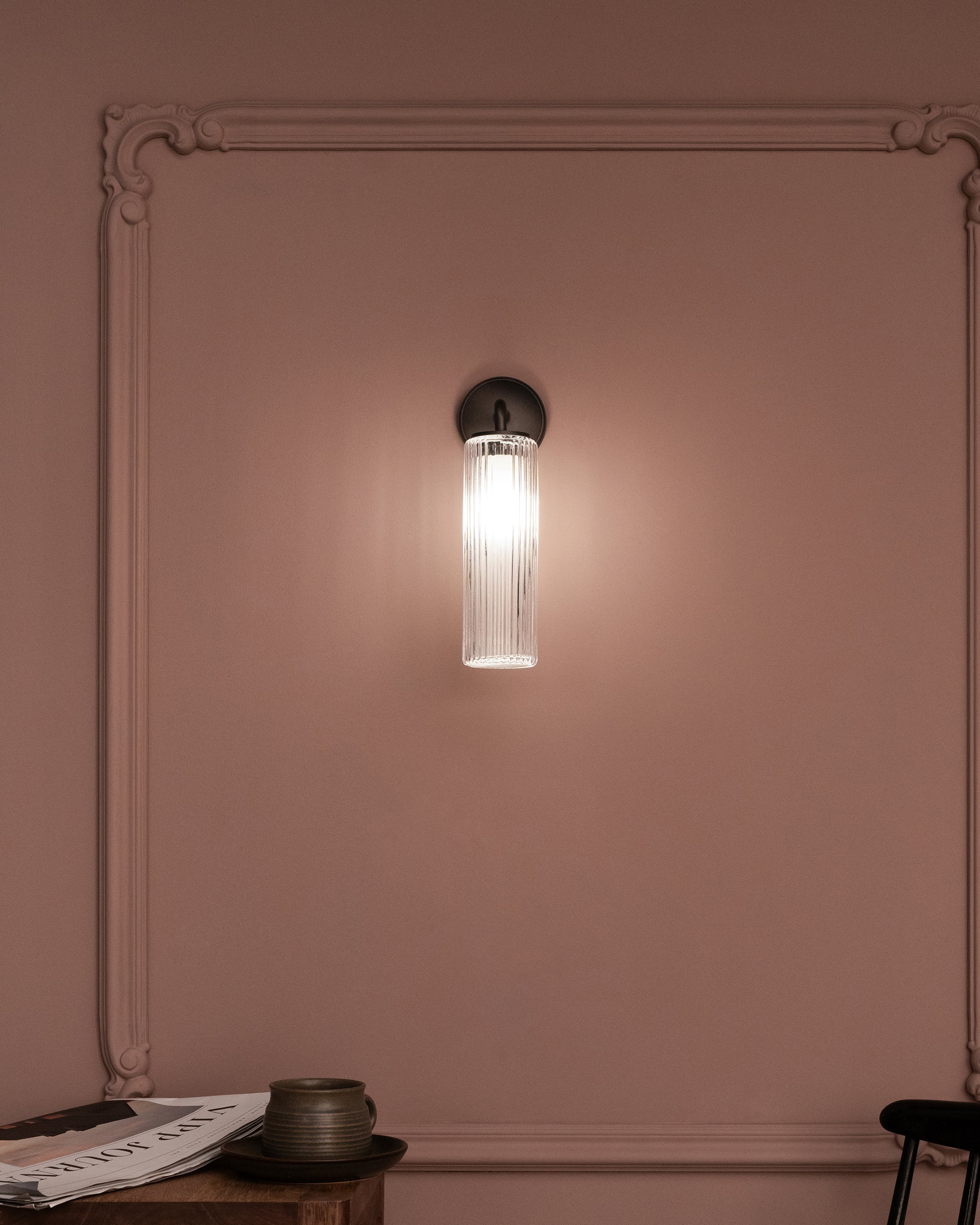 Bronze is our boldest finish, but it isn’t shiny or bright, so it has a subtle side to it too. It’s a deep matt brown colour that’s almost black in some lights. This fluted glass shade creates a diffused, anti-glare light that looks timeless on your walls.