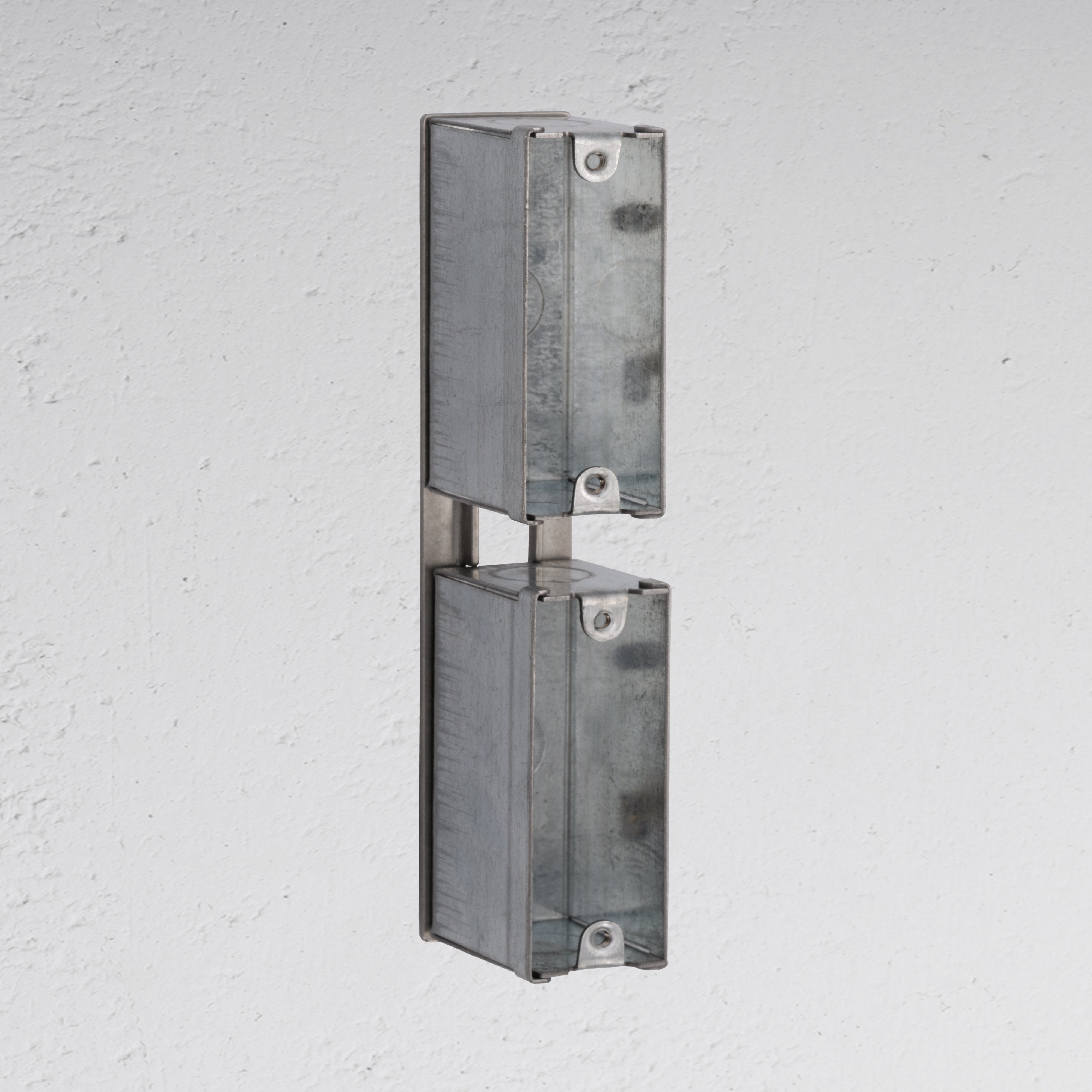 This double architrave back box is made from galvanised metal. It’s for solid walls or where studs are exposed and it’s deep enough to hold all the electrics inside.