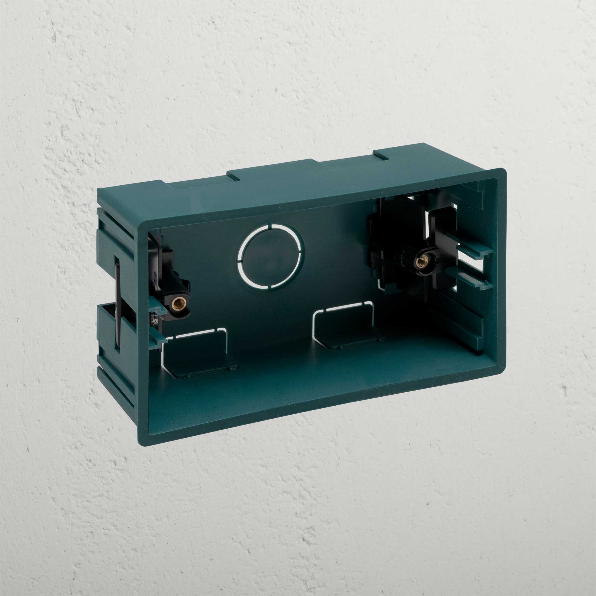 This double back box is made from fully recycled and recyclable post-consumer plastic. It’s for plasterboard cavity walls, so it has tabs and a lip that grip the plasterboard securely.