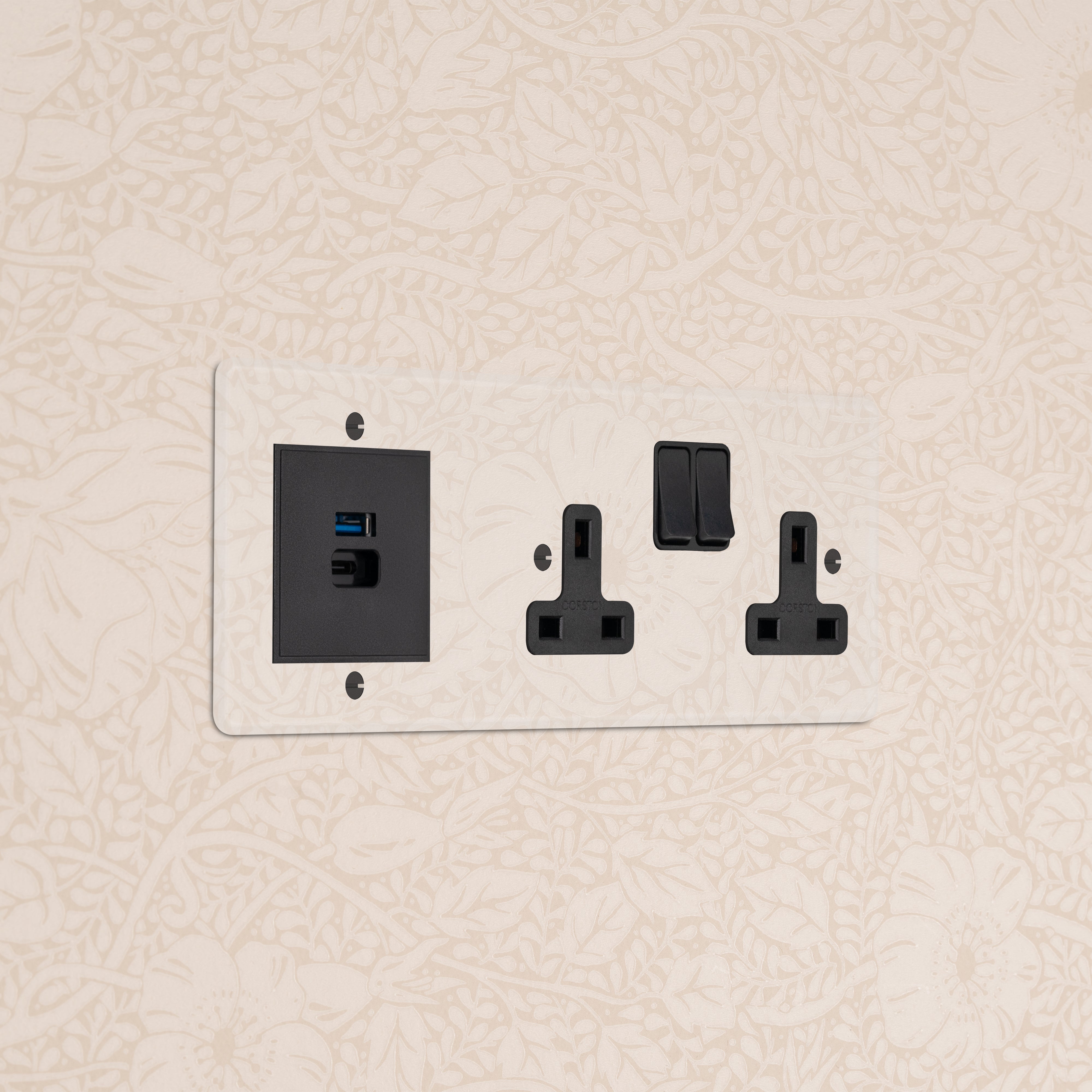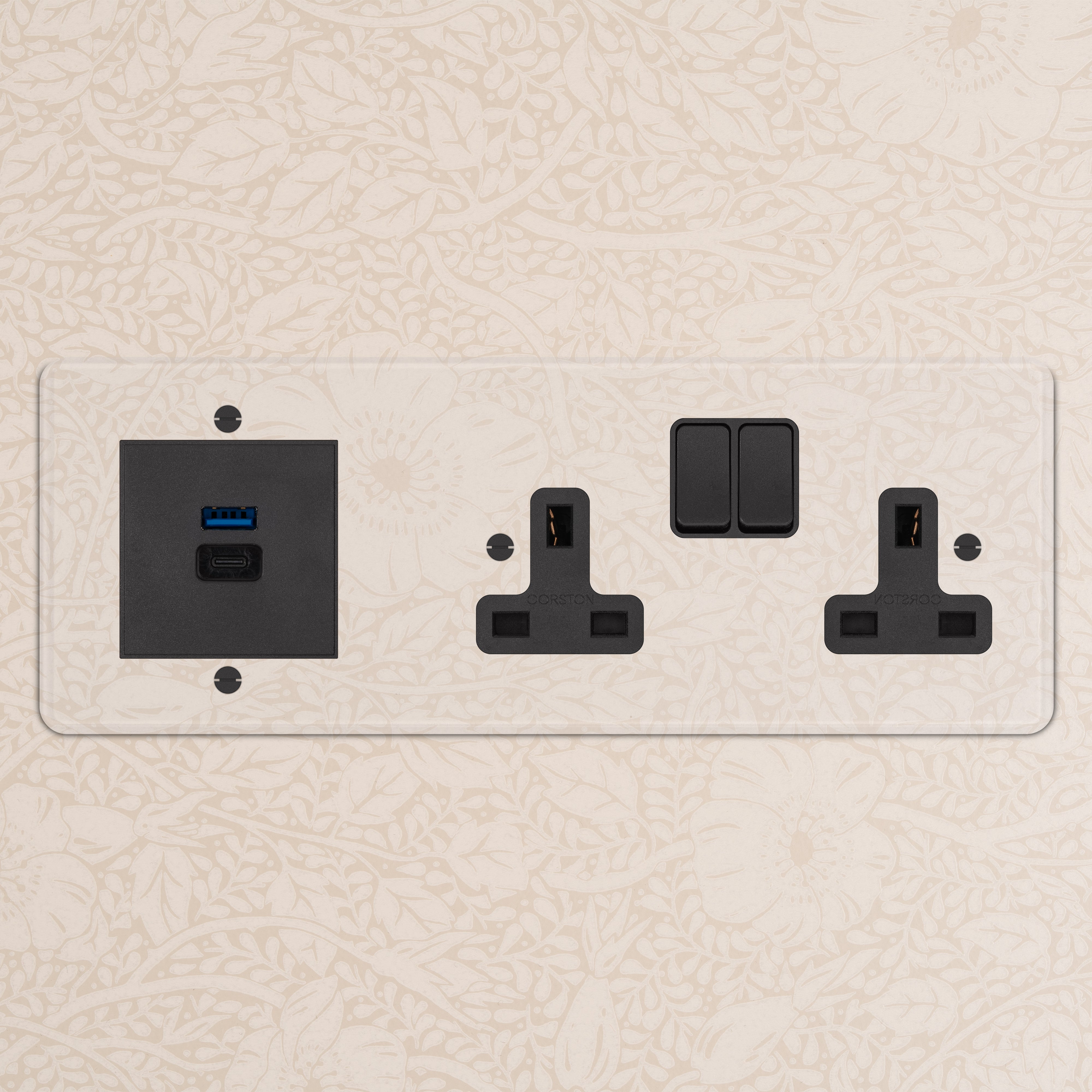 This triple mixed socket combines a two standard UK sockets and a dual USB-A+C socket on one plate.