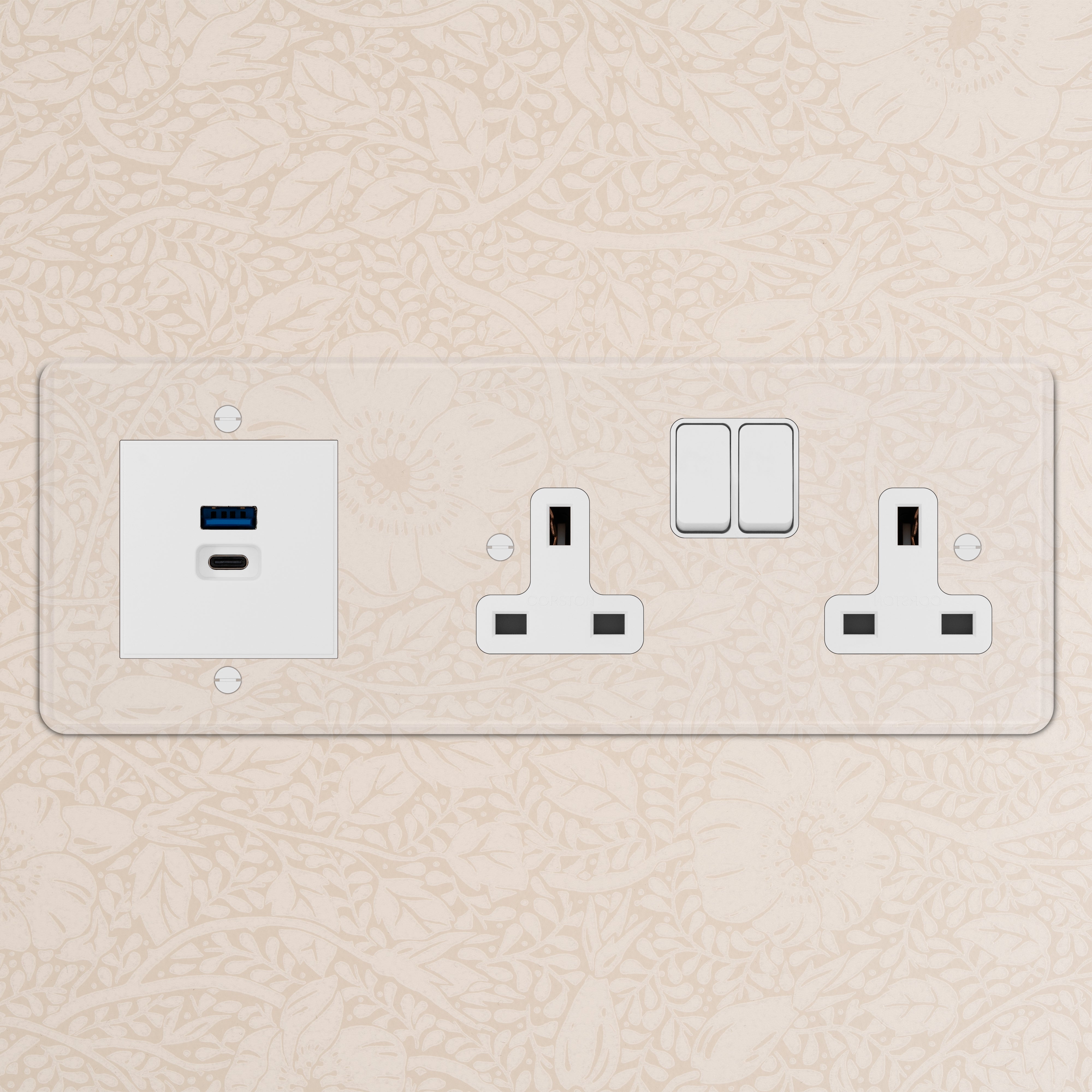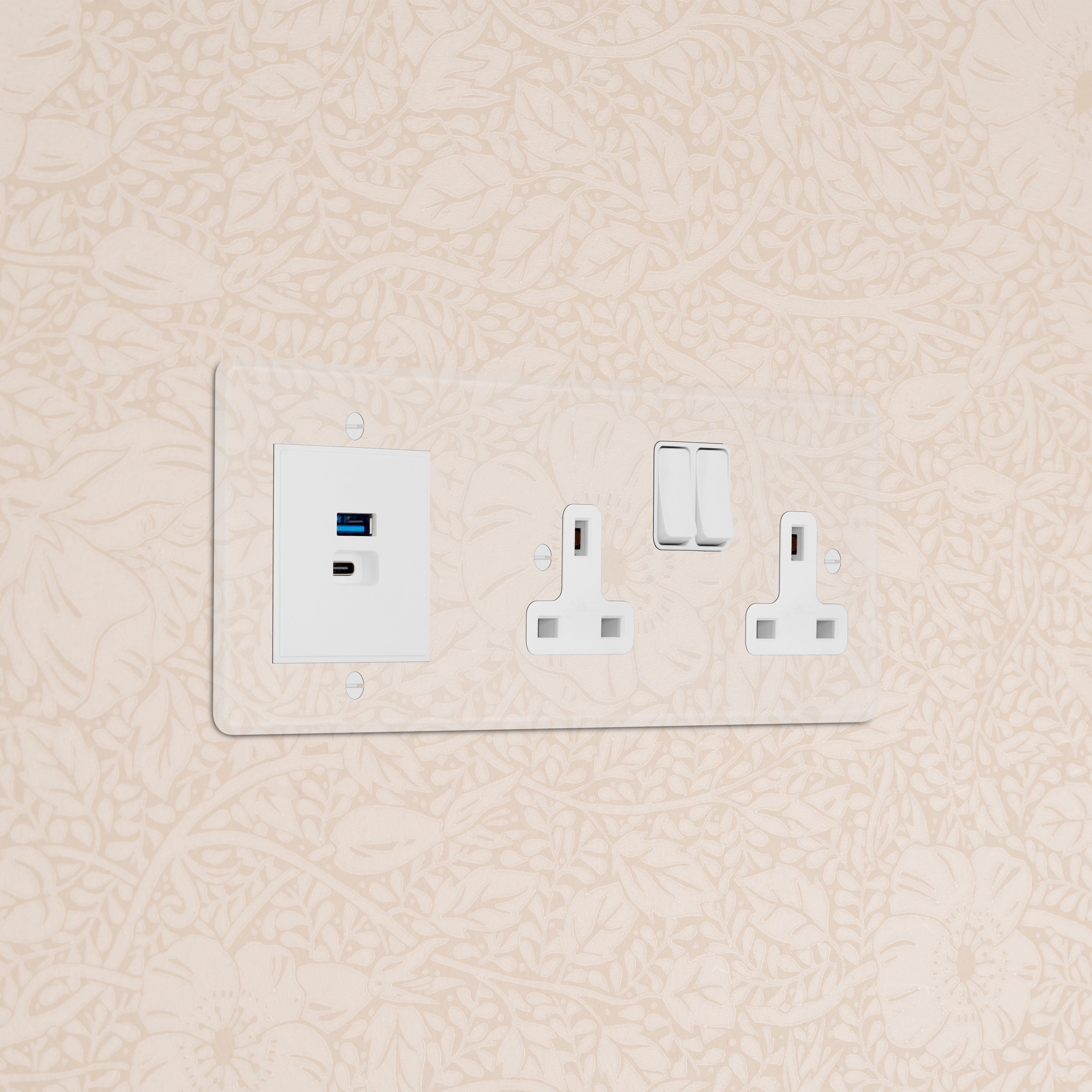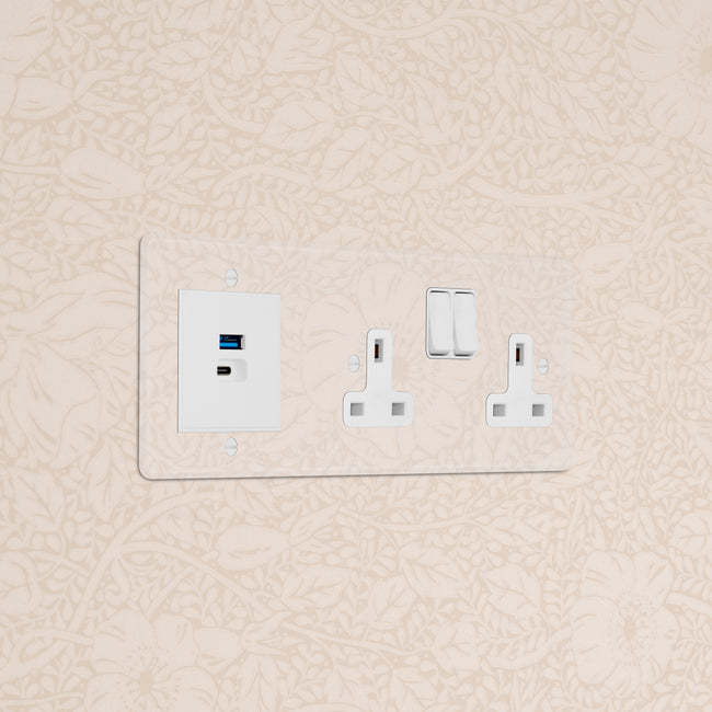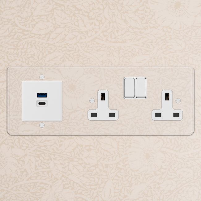 This triple mixed socket combines a two standard UK sockets and a dual USB-A+C socket on one plate.