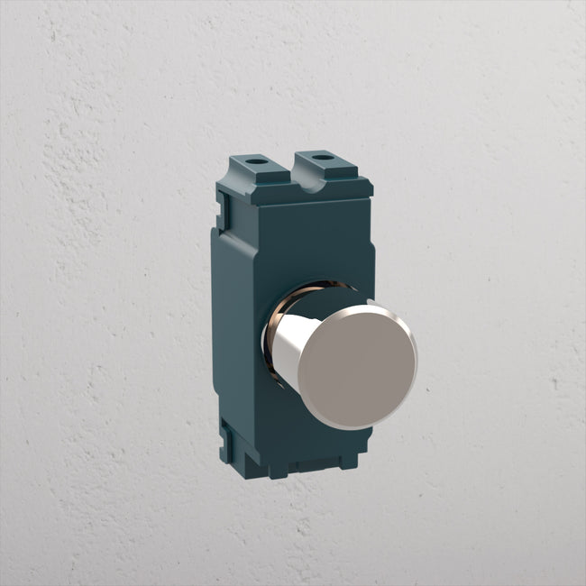 This polished nickel dummy rotary dimmer switch works with our clear switch plates. It has a collar underneath the knob that hides all the working parts.