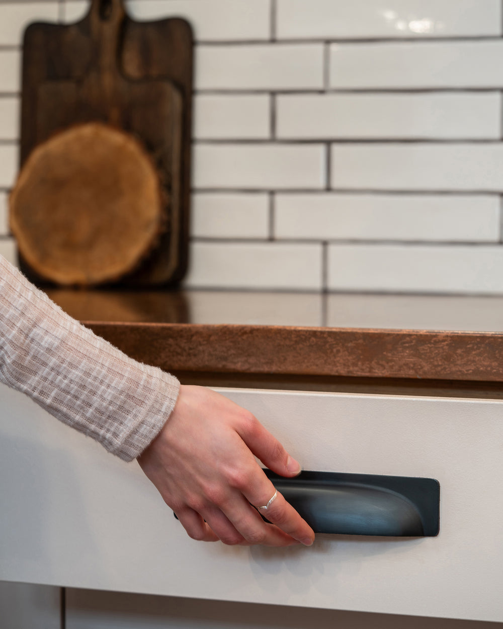 Our classic cup handle has a familiar, enduring feel, but it’s versatile enough to suit modern cabinetry too.