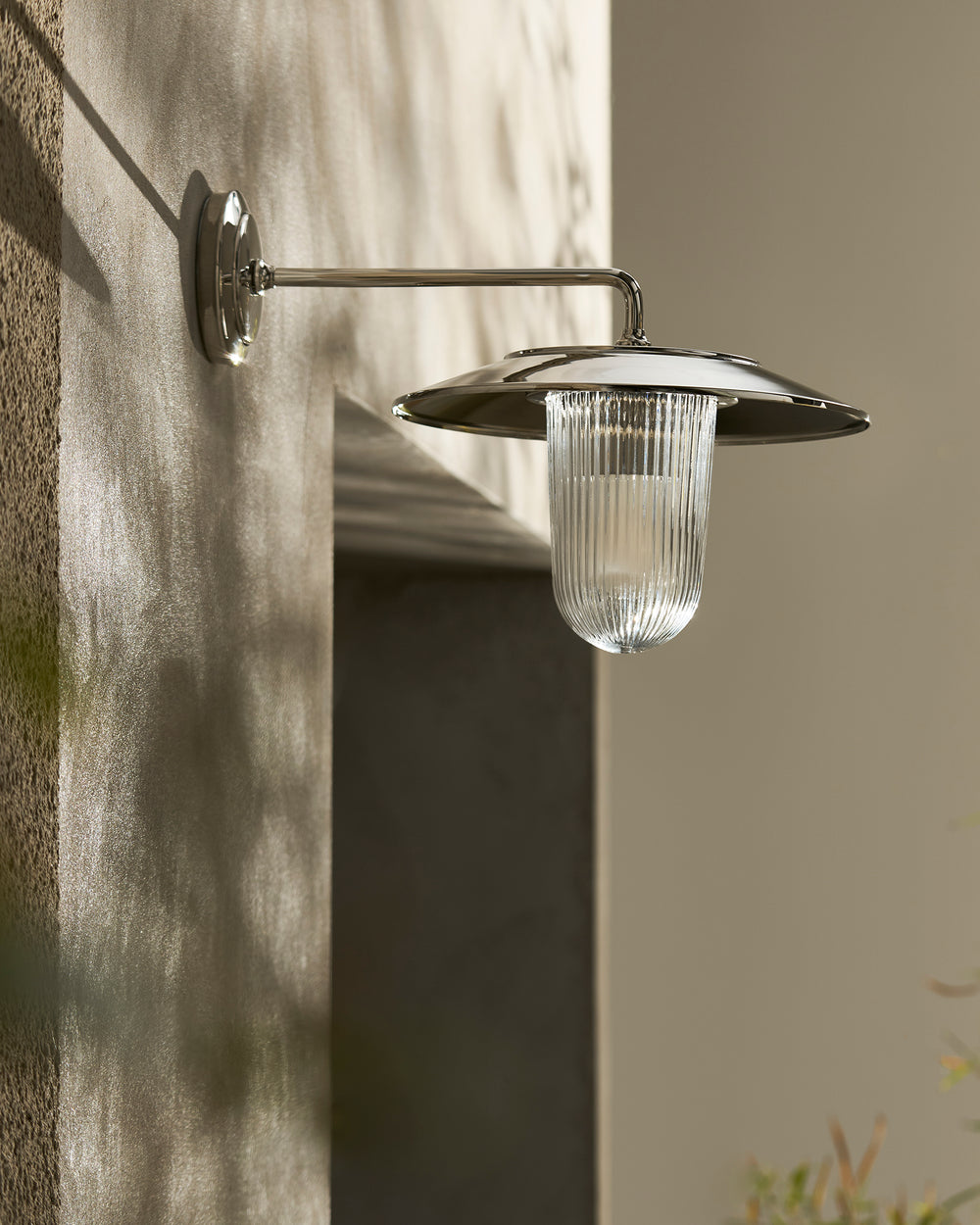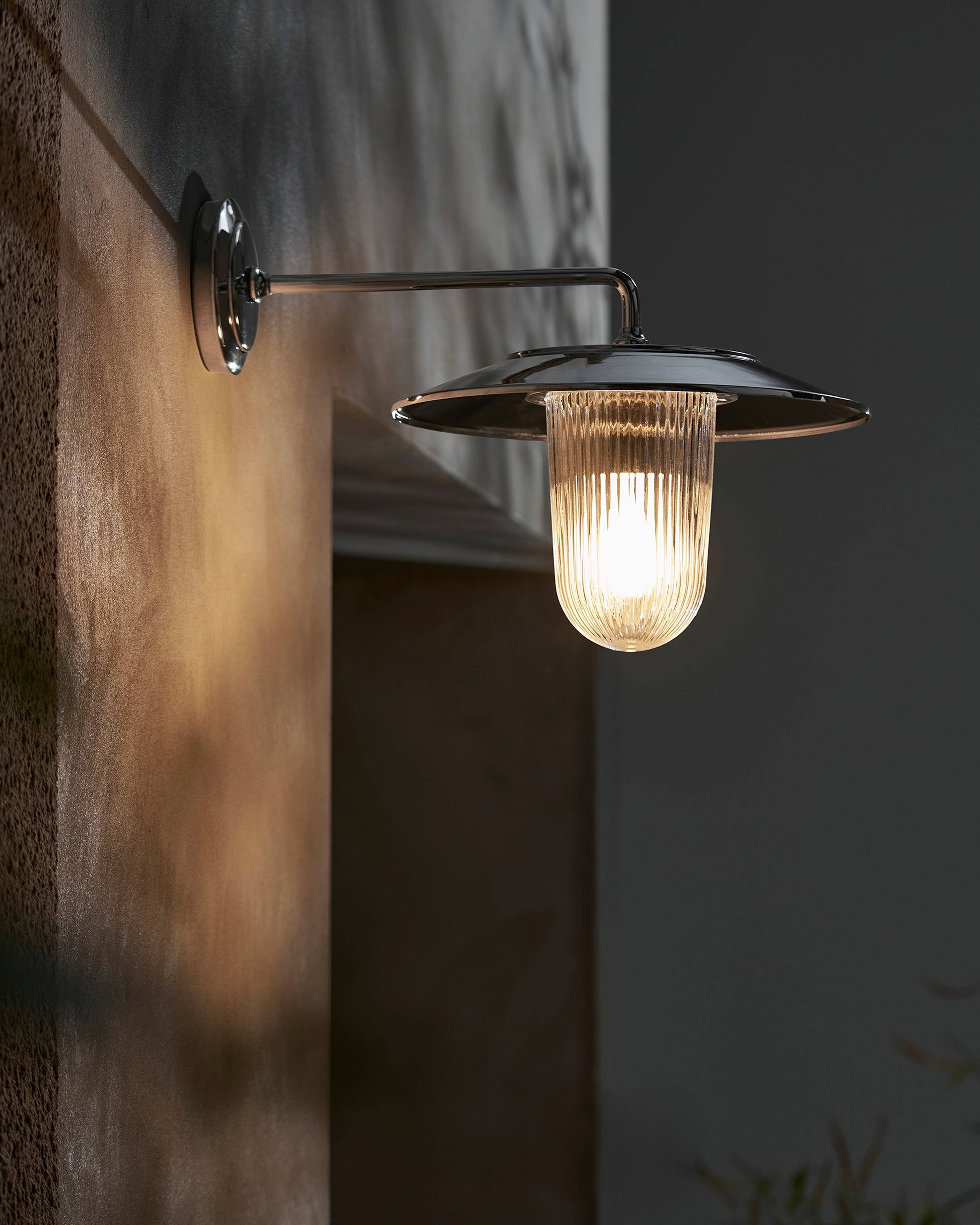 Our Kensington wall light has a large solid brass ‘cap’ to protect it from rain. The fluted glass cover provides 360-degree diffused lighting thanks to the vertical grooves.