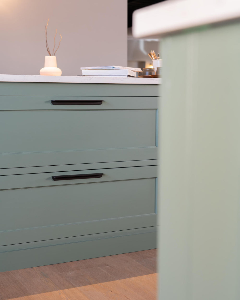 A modern, refined take on an edge pull handle with recessed grip detail for a firm hold.